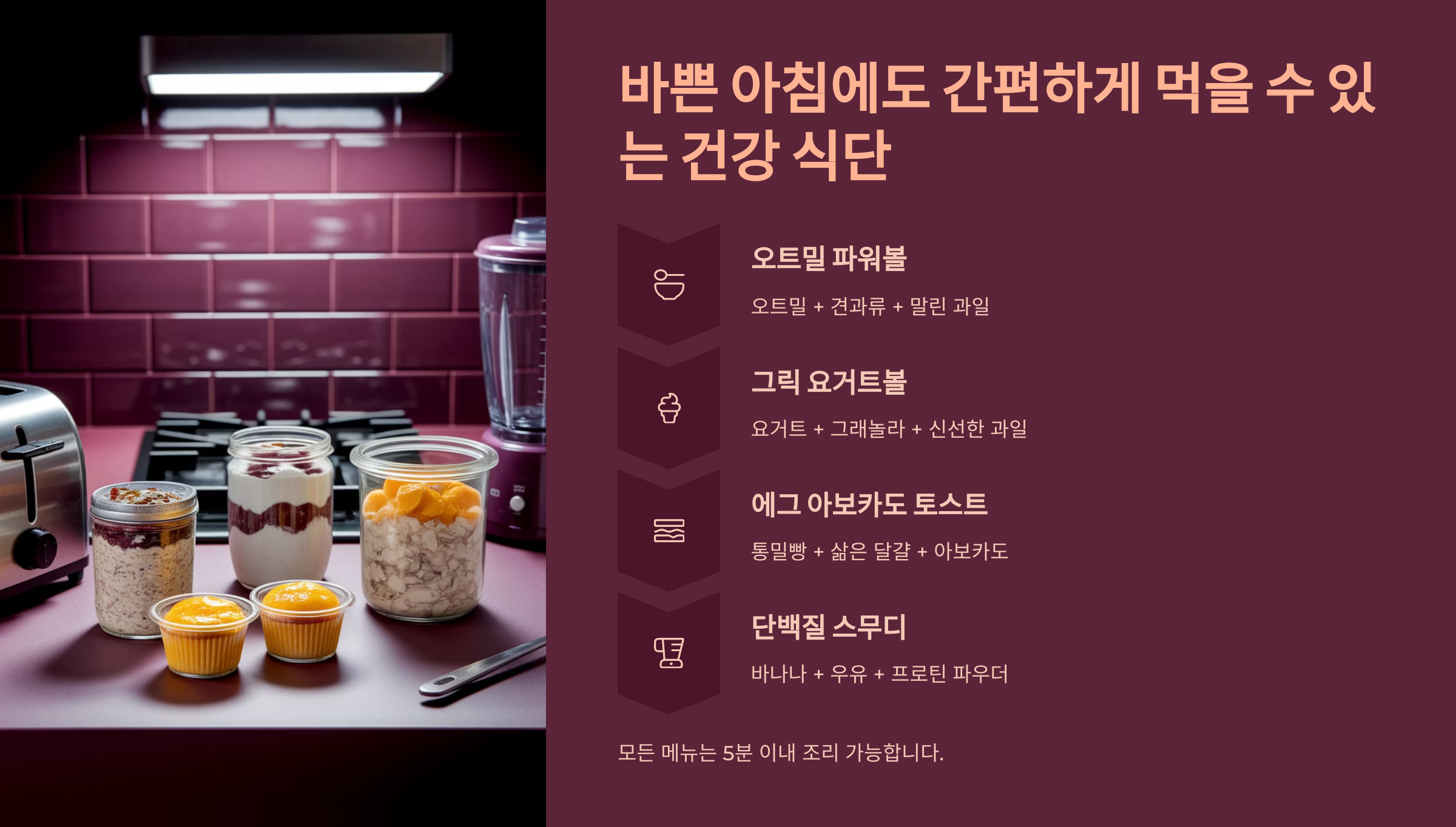| 오버나이트 오트밀 | 5분 (전날 준비) | 식이섬유, 단백질 |
