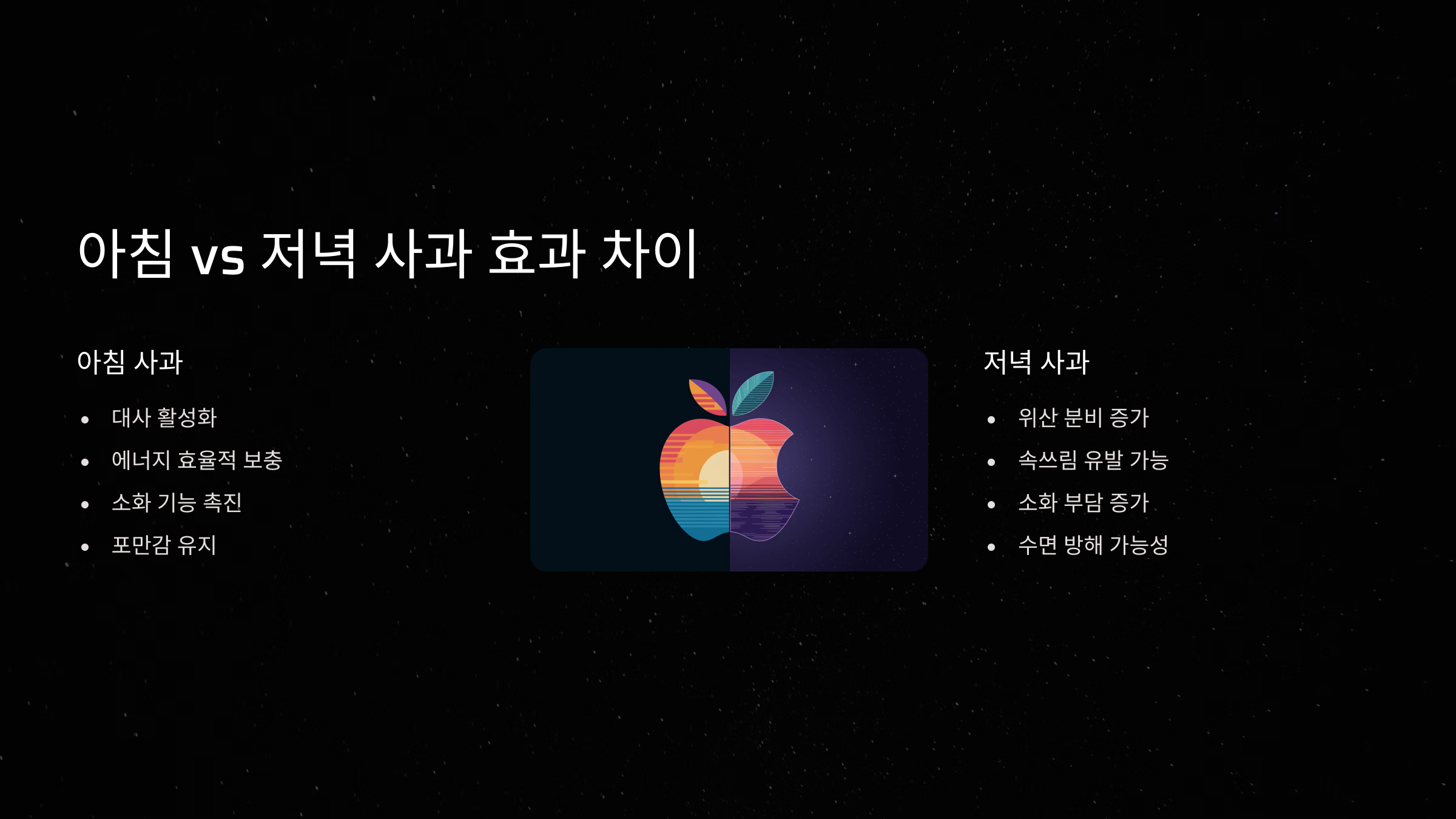 아침 사과는 혈당을 천천히 올려 신체 리듬을 깨우는 데 도움이 되고, 포만감이 있어 하루의 식욕도 조절해줘요. 공복에 먹어도 위에 부담이 적고, 하루 컨디션에 좋은 영향을 줘요. 반면 저녁 사과는 섬유질이 소화에 걸리는 시간이 길어, 위에 부담을 줄 수 있어요.