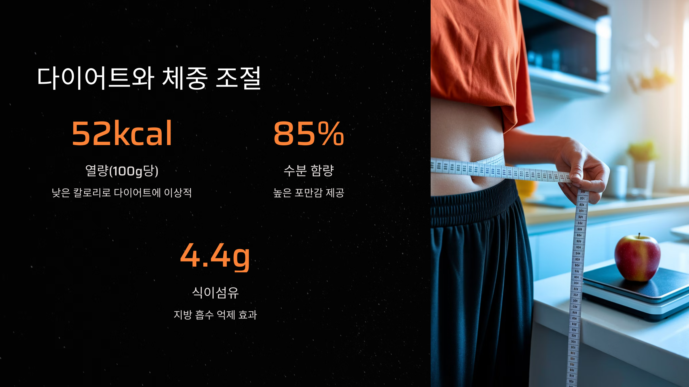 식이섬유는 위에 머무는 시간이 길기 때문에 적은 양만 먹어도 배부른 느낌을 줘요. 게다가 사과는 자연스러운 단맛이 있어 다이어트 중에도 단 음식을 찾고 싶을 때 건강하게 대체할 수 있어요. 칼로리는 낮고 만족도는 높은 과일이죠.