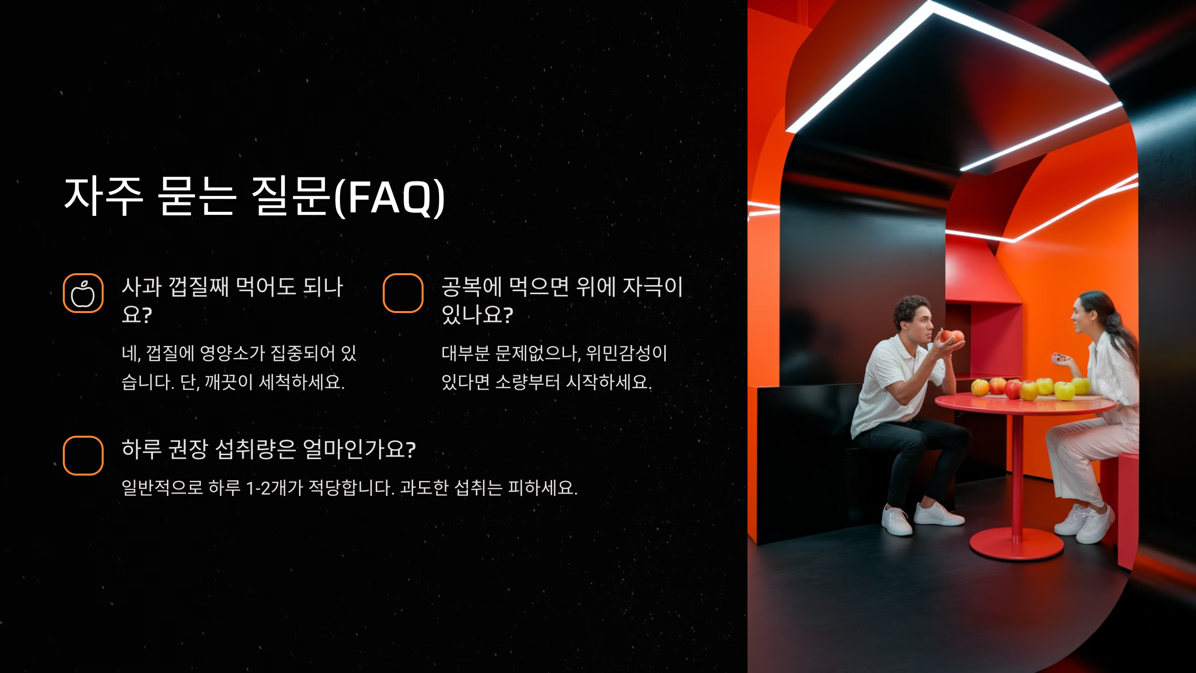 A2. 사과는 산도가 낮고 소화가 잘 되는 과일이라 공복에도 비교적 안전해요. 위가 약한 분도 큰 부담 없어요.
