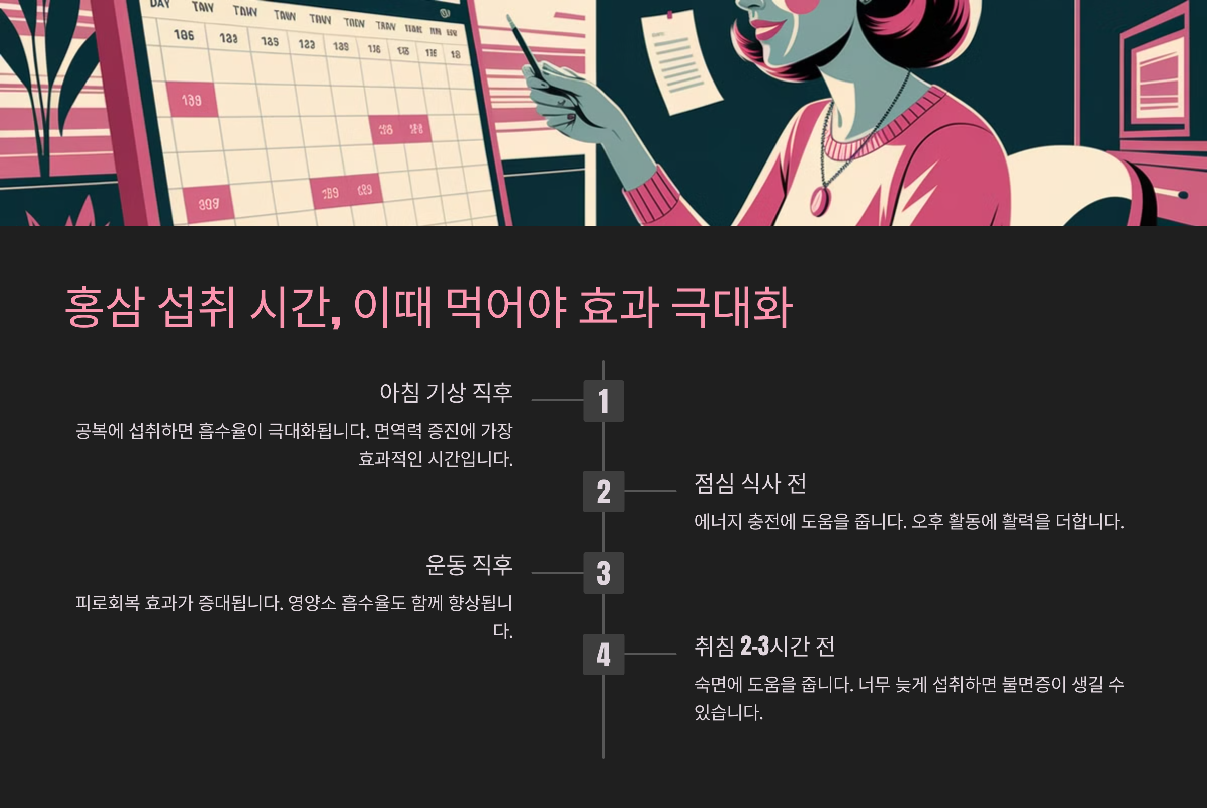 홍삼은 언제 먹느냐에 따라 효과가 달라질 수 있어요. 아무 때나 먹어도 좋은 줄 알았다면 오산! 최적의 섭취 타이밍을 잘 알고 먹어야 홍삼의 진짜 효능을 누릴 수 있답니다. ⏰
