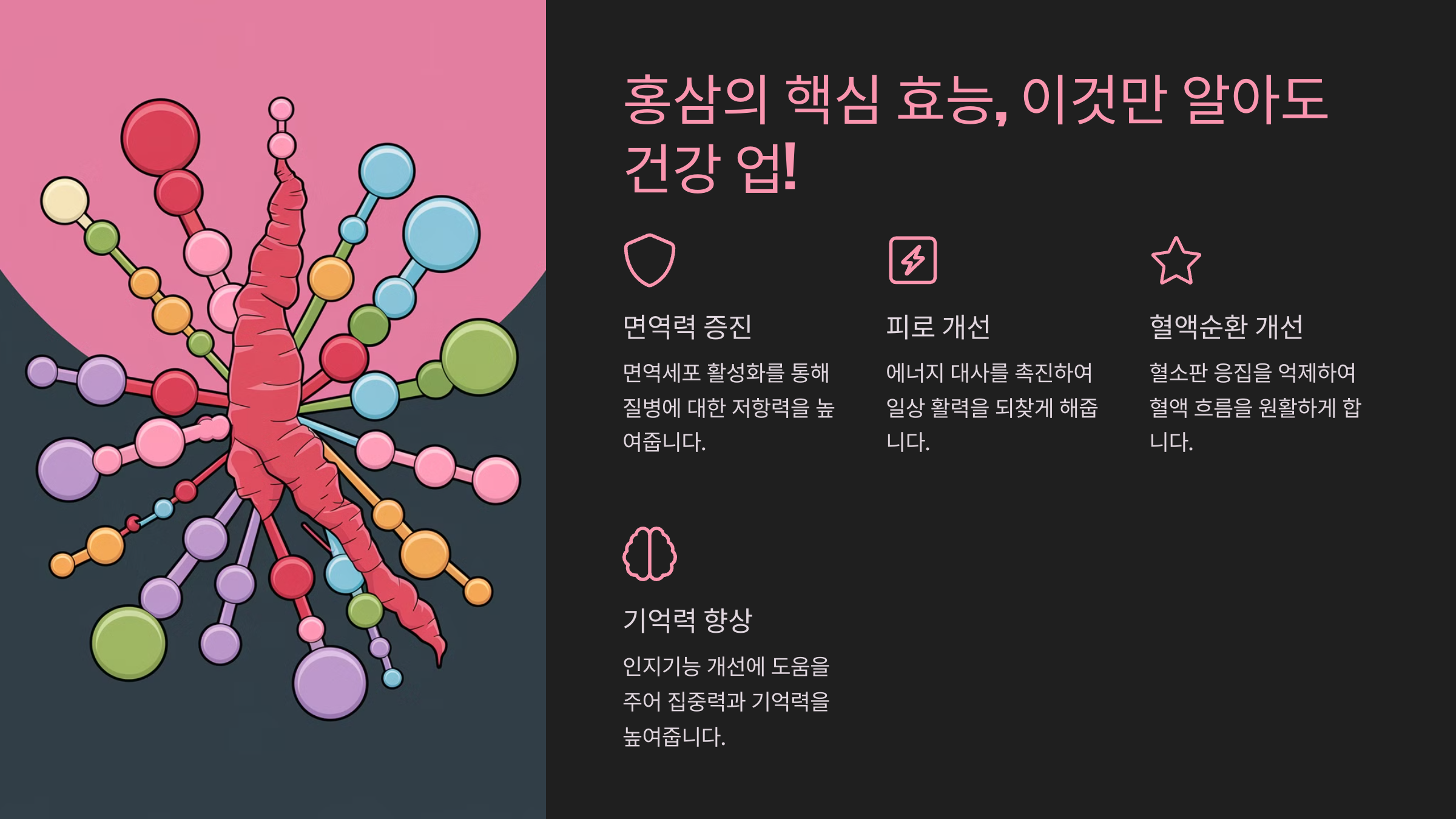 홍삼은 단순한 건강 보조식품이 아니라, 과학적으로 검증된 다양한 효능을 가지고 있어요. 특히 면역력 강화, 혈액순환 개선, 피로 회복 등에서 탁월한 효과를 발휘한답니다! 💪