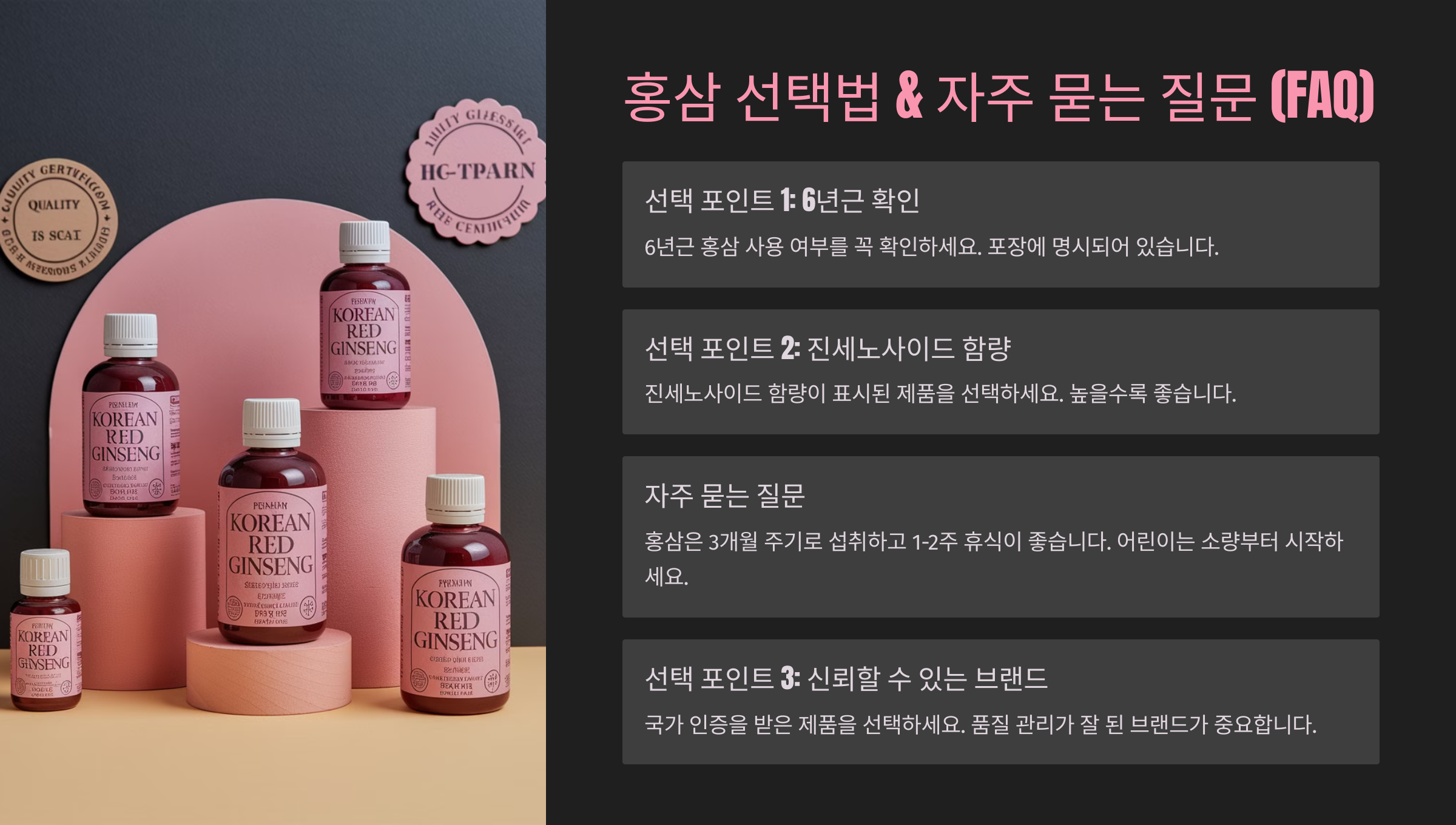 그럼 홍삼을 선택할 때 어떤 기준을 봐야 하는지 정리해볼게요! ✅