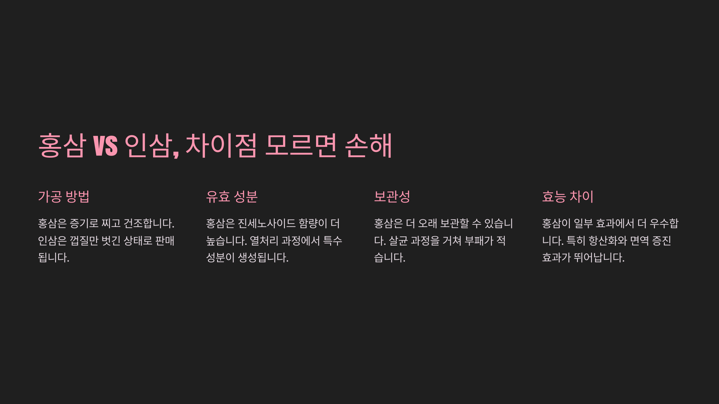 그럼 홍삼과 인삼의 차이를 좀 더 자세히 비교해볼까요? 👇