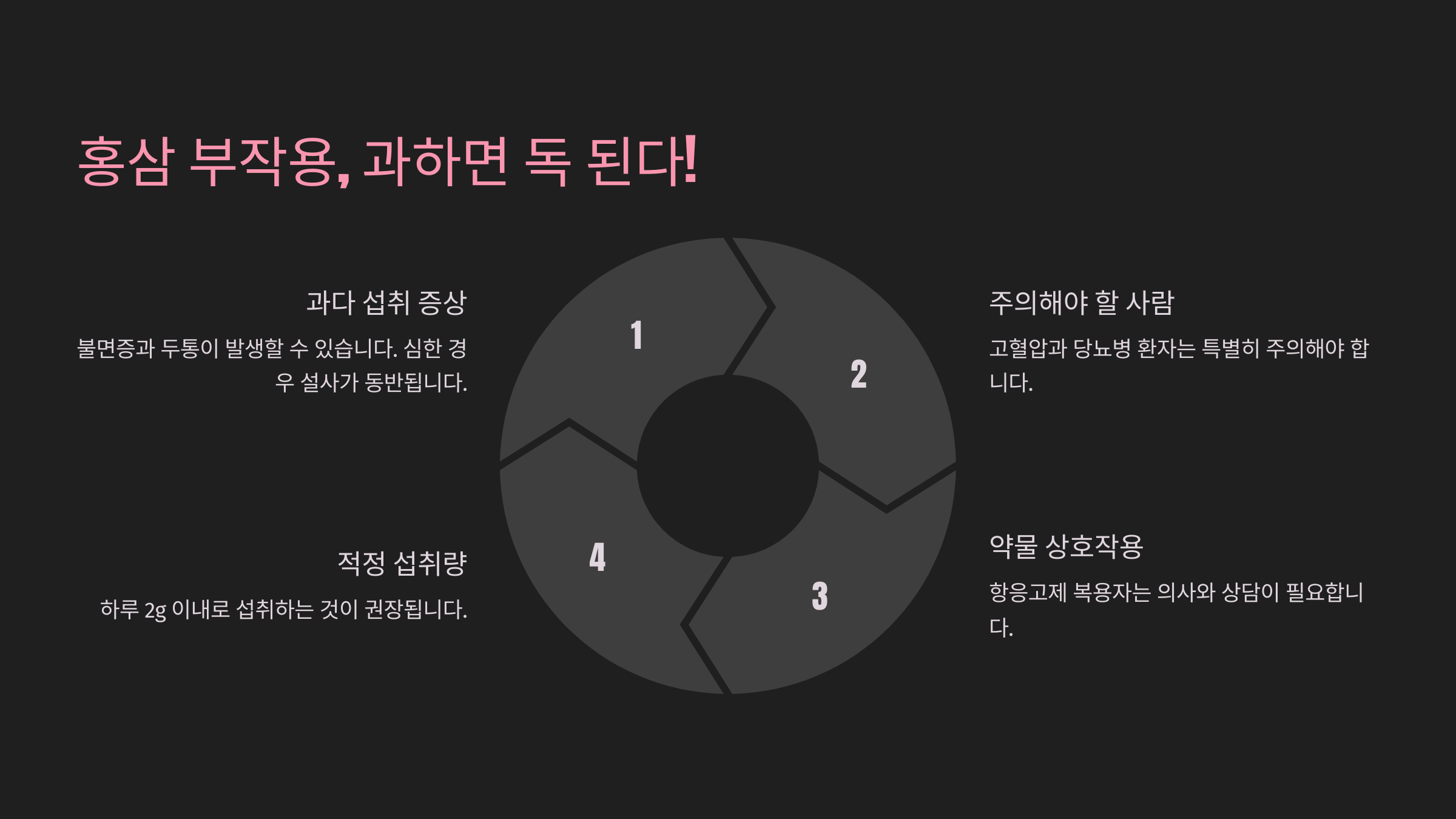 하지만! 홍삼도 너무 많이 먹으면 부작용이 있을 수 있어요. 홍삼을 먹을 때 주의해야 할 점, 바로 알아볼까요? ⚠️