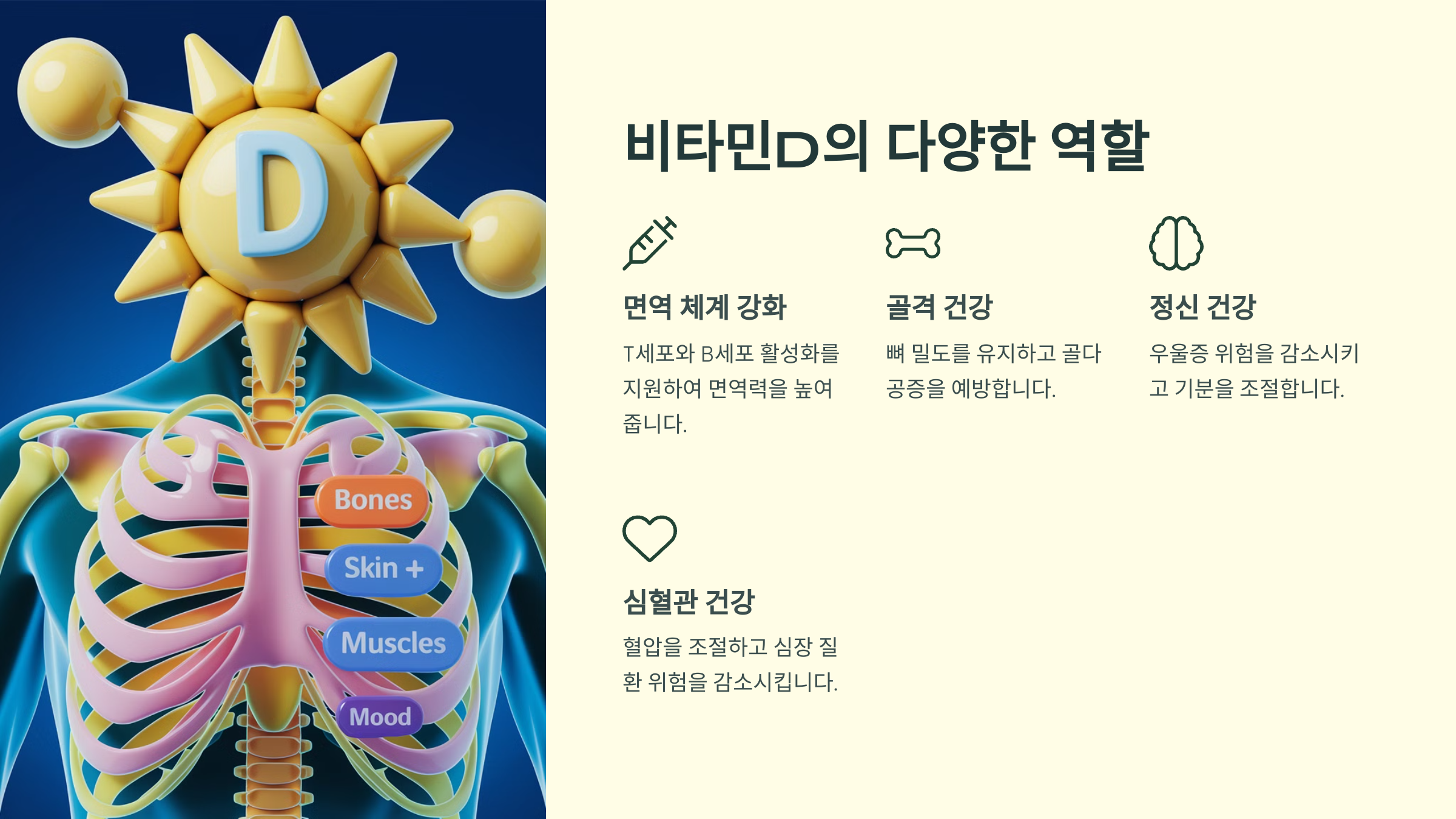 이제 비타민D의 숨겨진 효능에 대해 알아볼까요? 면역력 강화부터 심혈관 건강까지, 비타민D가 우리 몸에서 하는 역할을 더 자세히 살펴볼게요! 🏋️♂️