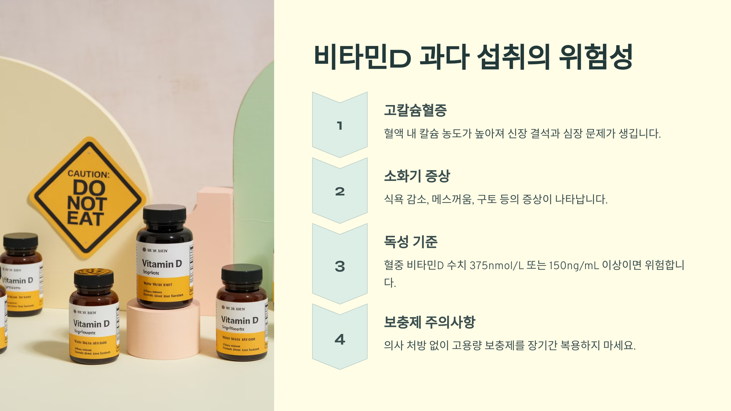 비타민D는 부족해도 문제지만, 너무 많이 섭취하면 건강에 치명적인 영향을 미칠 수 있어요. 과다 복용하면 체내 칼슘 수치가 비정상적으로 높아져 신장과 심혈관계에 악영향을 줄 수 있어요. 🚨