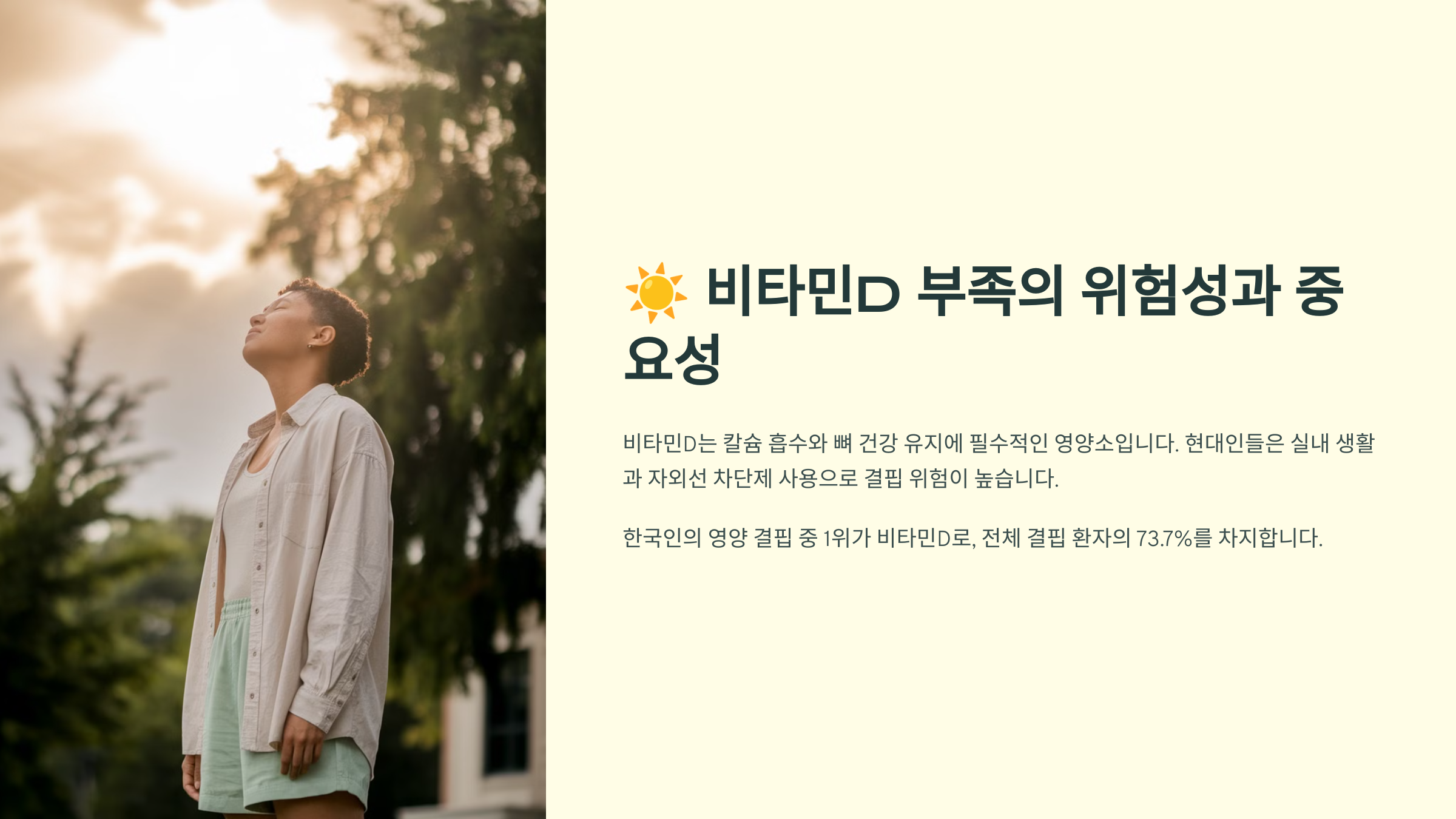 비타민D가 부족하면 몸에서 칼슘을 제대로 흡수하지 못해 뼈가 약해지고 골다공증 위험이 커져요.