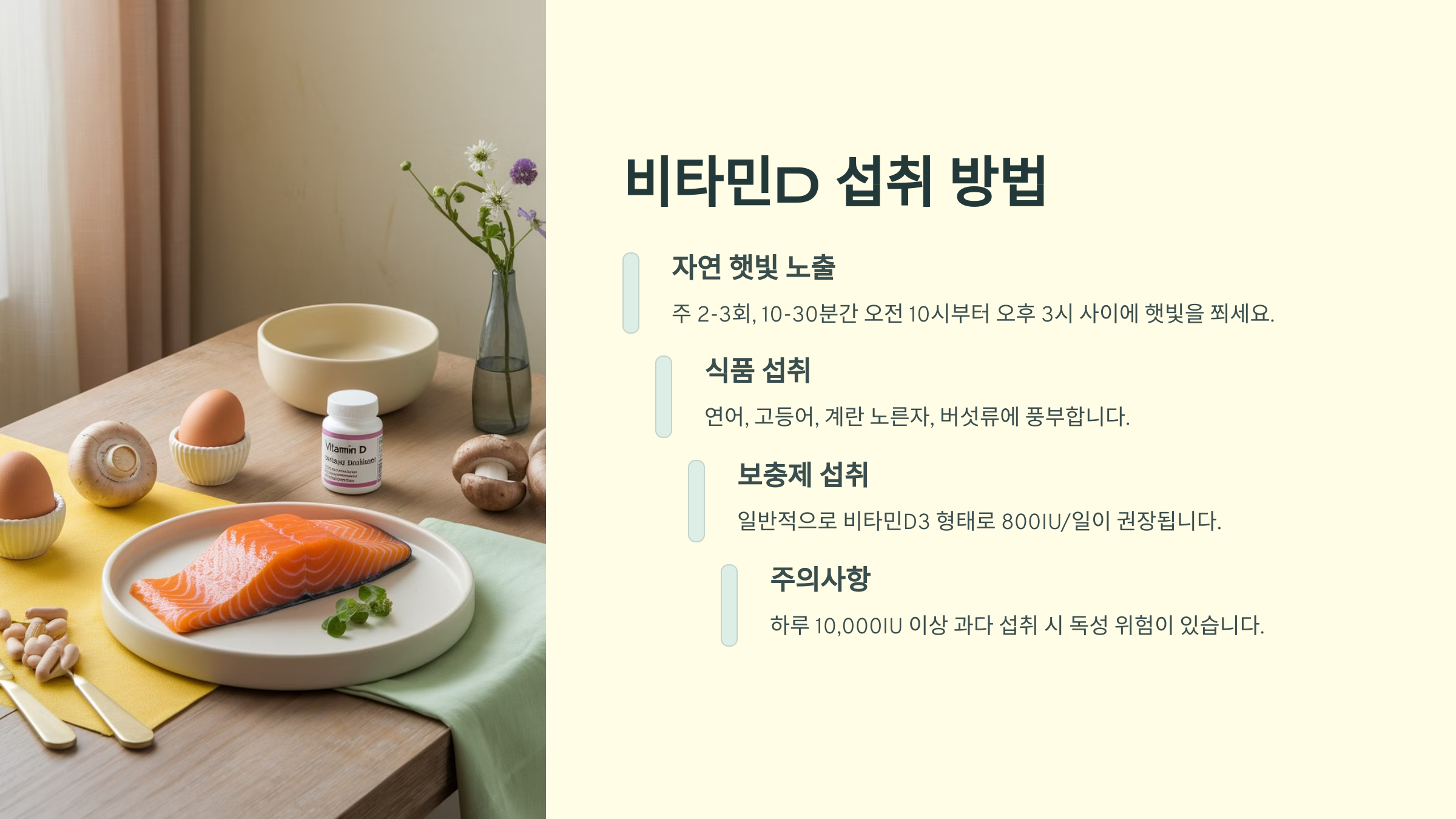 햇빛 노출이 어렵거나 음식만으로 충분하지 않다면, 보충제를 섭취하는 것도 방법이에요. 하루 권장량은 개인의 건강 상태에 따라 다를 수 있으니 전문가 상담 후 섭취하는 게 좋아요.