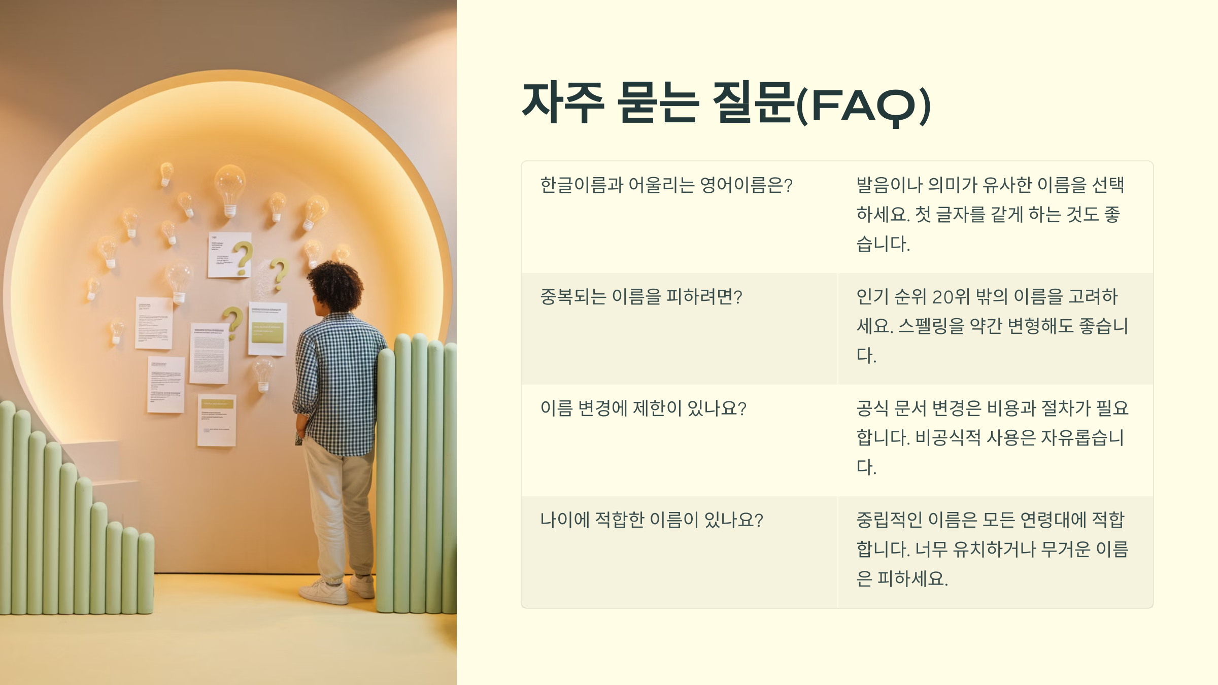 A7. 꼭 그렇진 않아요. 흔한 이름이라도 잘 어울리면 충분히 매력 있어요. 다만 독특한 이름을 선호하면 유니크한 스타일도 고려해보세요.