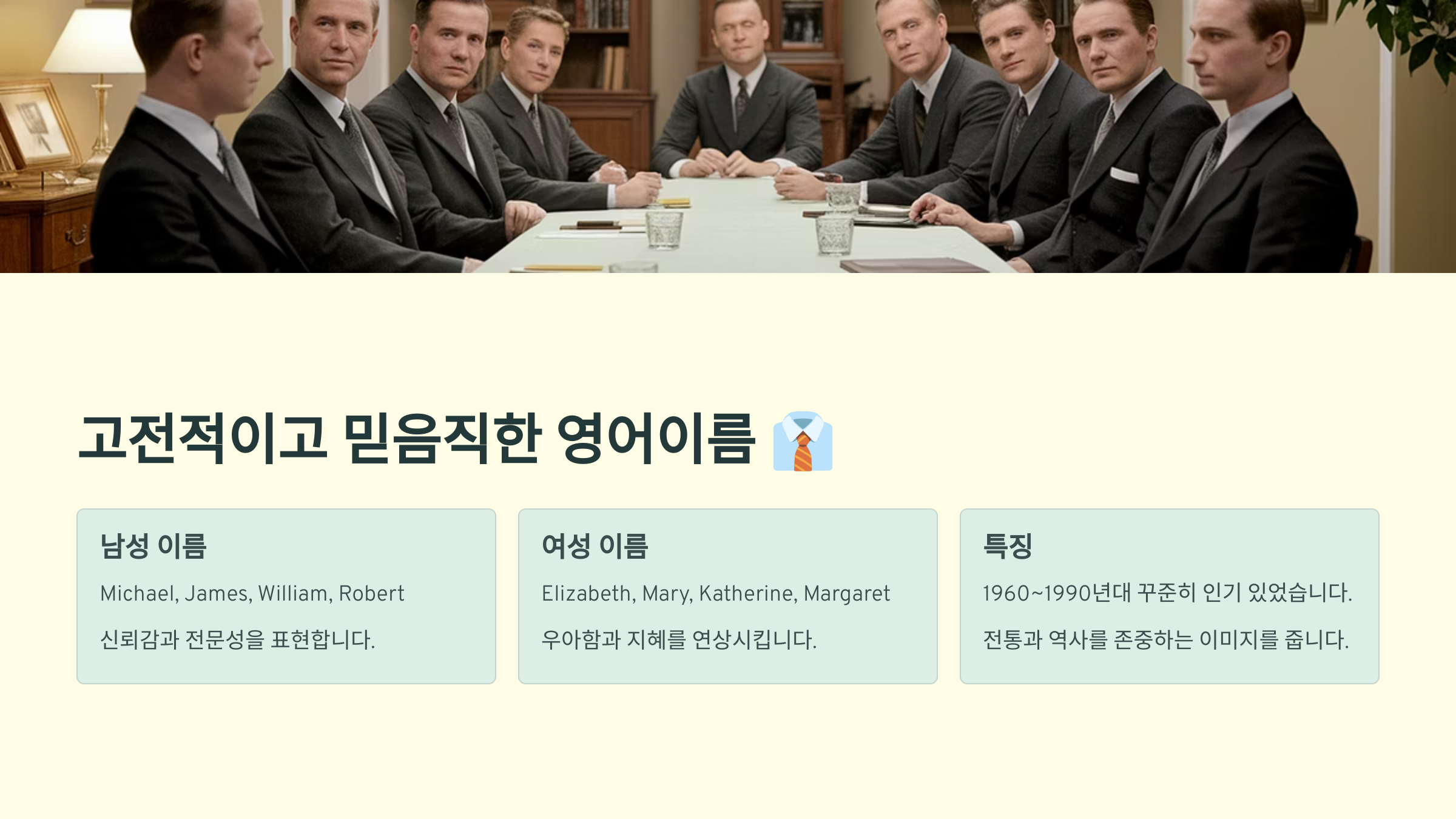 전통적이고 클래식한 영어 이름은 언제나 안정감을 줘요. 믿음직하고 성숙한 인상을 주고 싶다면 이런 이름이 제격이에요. 특히 비즈니스, 학문, 법률계에서도 좋은 인상을 주는 이름들이 많답니다.