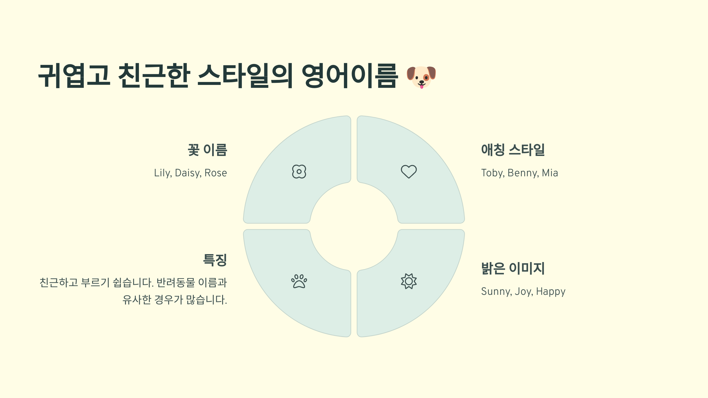 이제 다음 섹션에서는 귀엽고 친근한 분위기의 영어 이름들을 소개할게요! 🐶