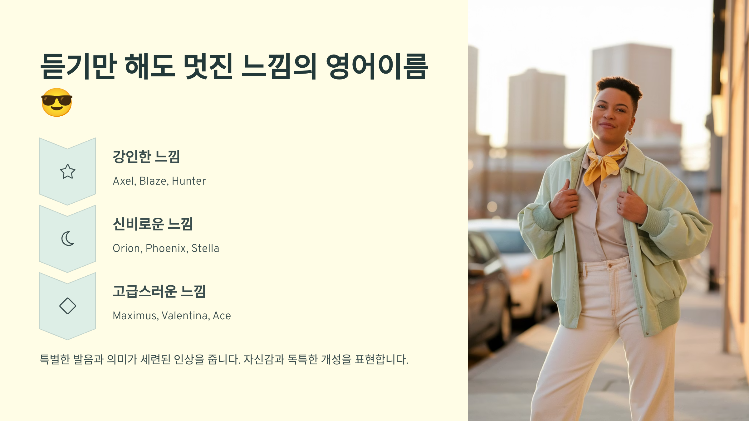 다음은 이름만 들어도 "와 멋있다!" 하고 느껴지는 쿨한 영어 이름들을 소개할게요! 😎