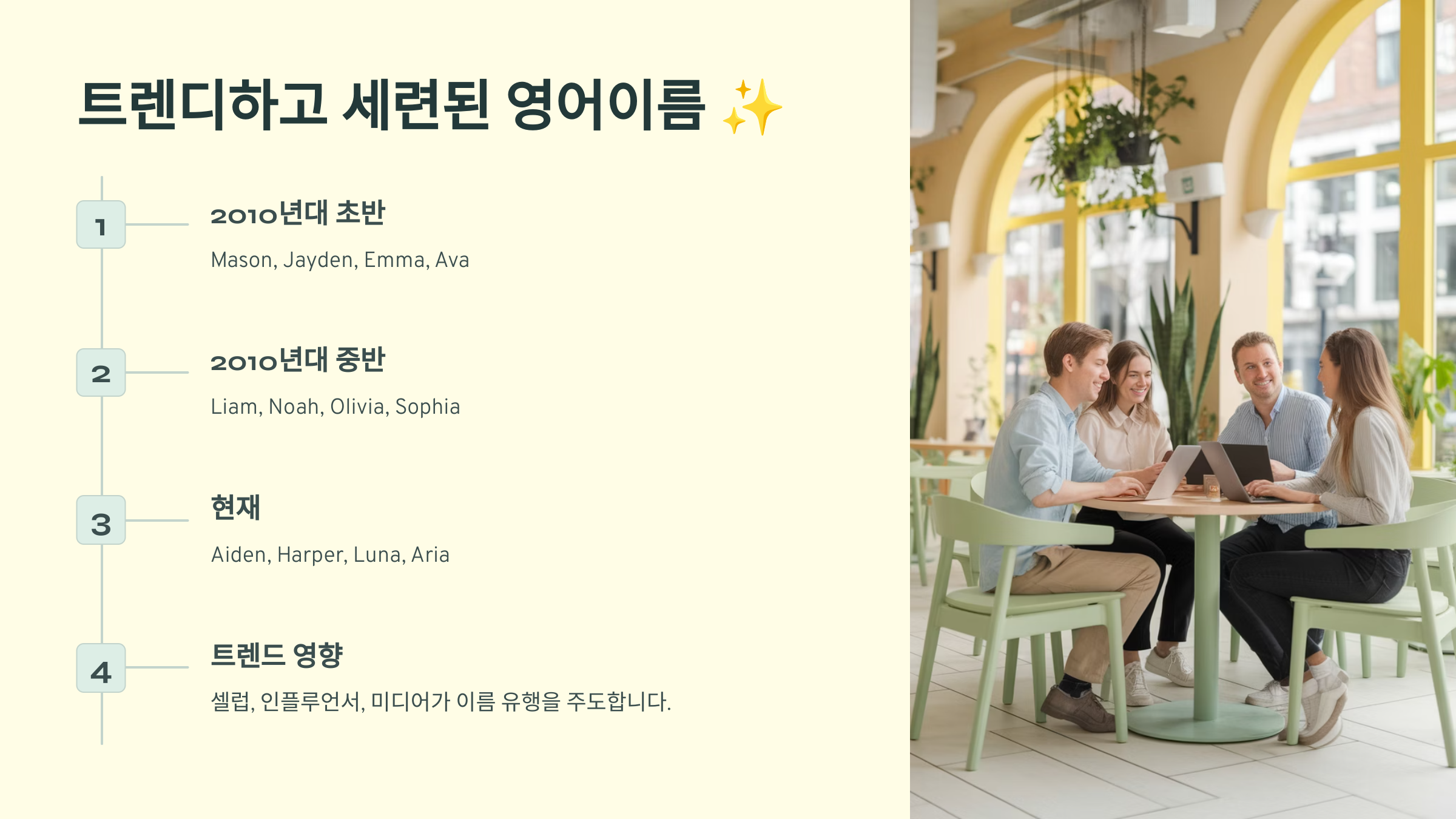 다음 섹션에서는 요즘 인기 많은 트렌디하고 세련된 영어 이름을 소개할게요! 🧑💼