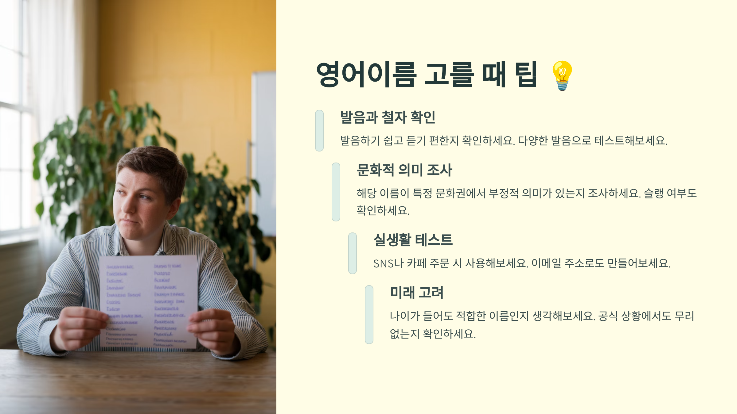 이제 영어 이름을 고를 때 참고하면 좋은 팁들을 알려드릴게요. 이름 선택, 어렵지 않아요! 💡