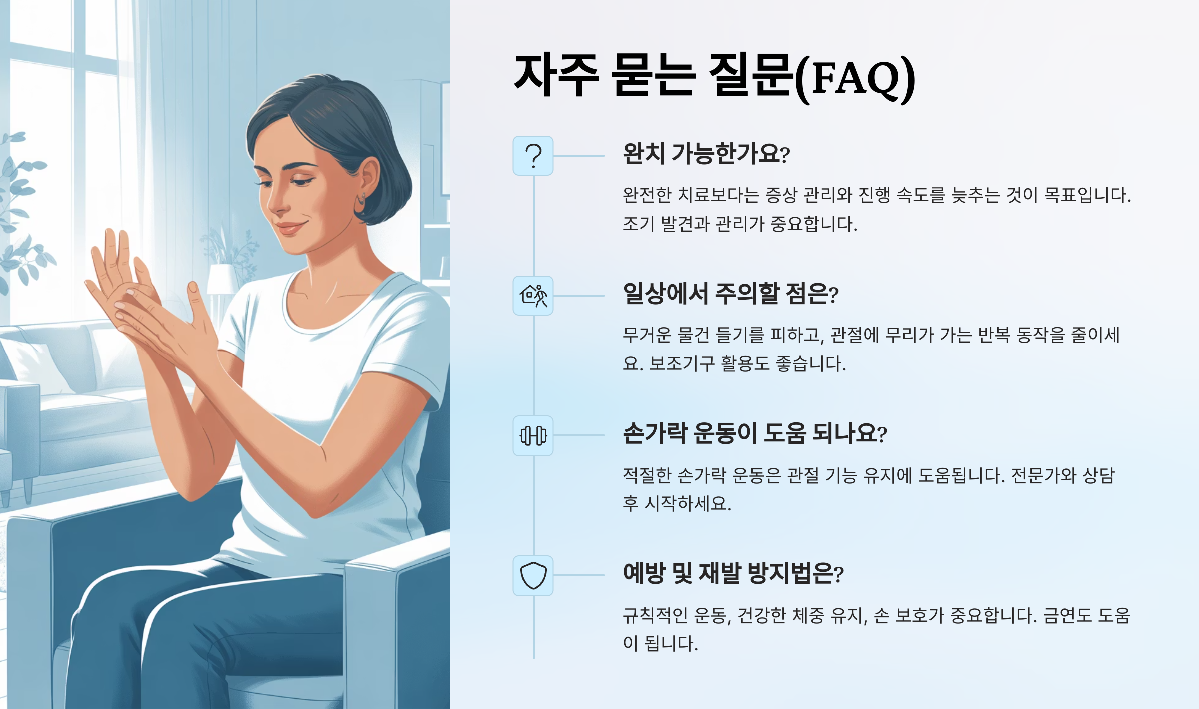 자가 진단만으로 방심하거나 인터넷 정보에만 의존하는 건 위험해요. 증상마다 사람마다 다르기 때문에 반드시 전문의의 판단이 필요해요. 병원을 빨리 찾는 것이 ‘손가락 변형을 막는 가장 확실한 길’이에요.