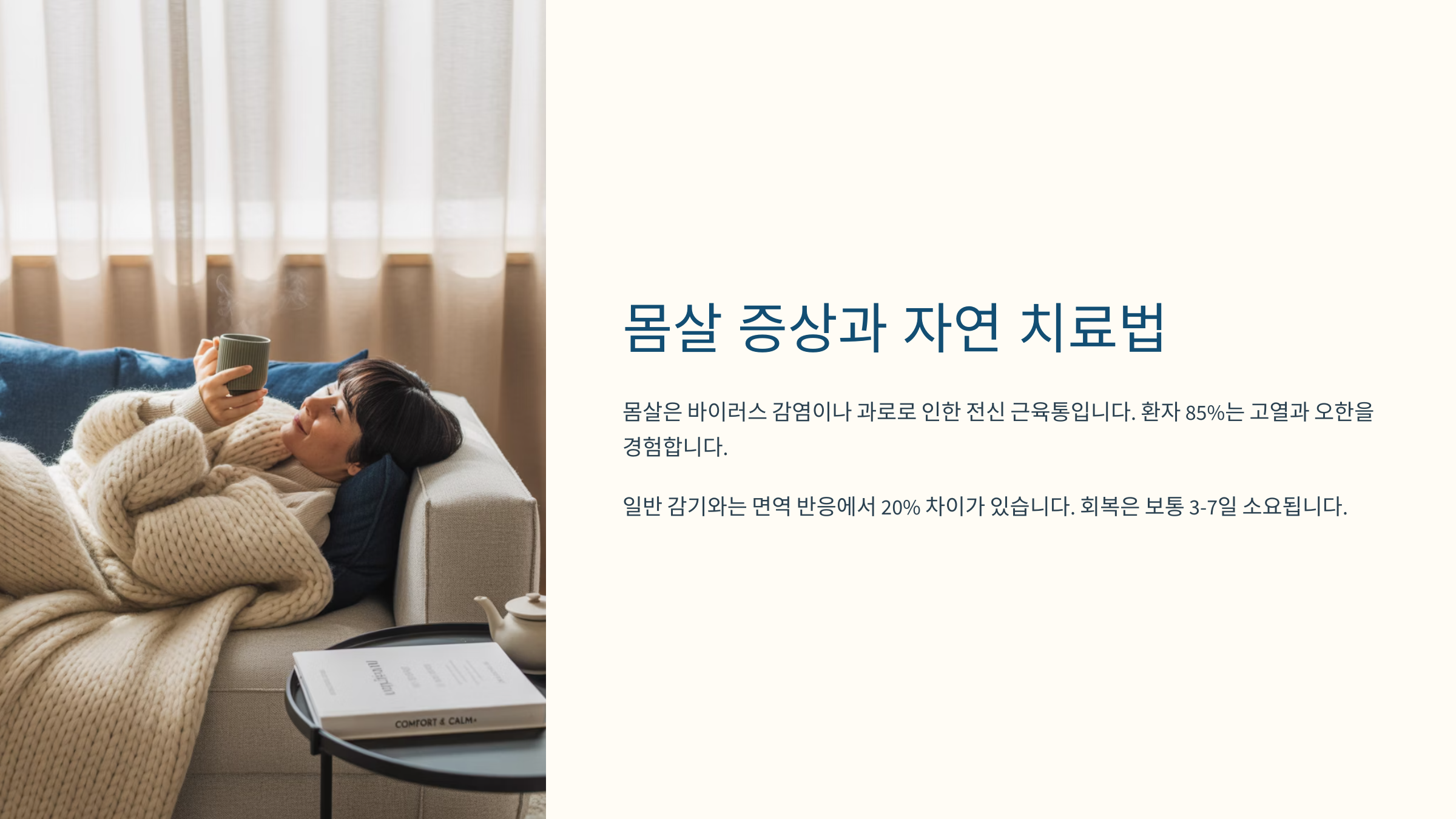 몸살은 과로, 스트레스, 감기 바이러스 등으로 인해 온몸에 통증과 피로감이 나타나는 증상을 말해요. 열이 나거나 두통이 동반되기도 하고, 근육통과 관절통이 함께 나타나기도 해요. 일상 속 누구에게나 찾아올 수 있는 아주 흔한 몸의 경고 신호예요.