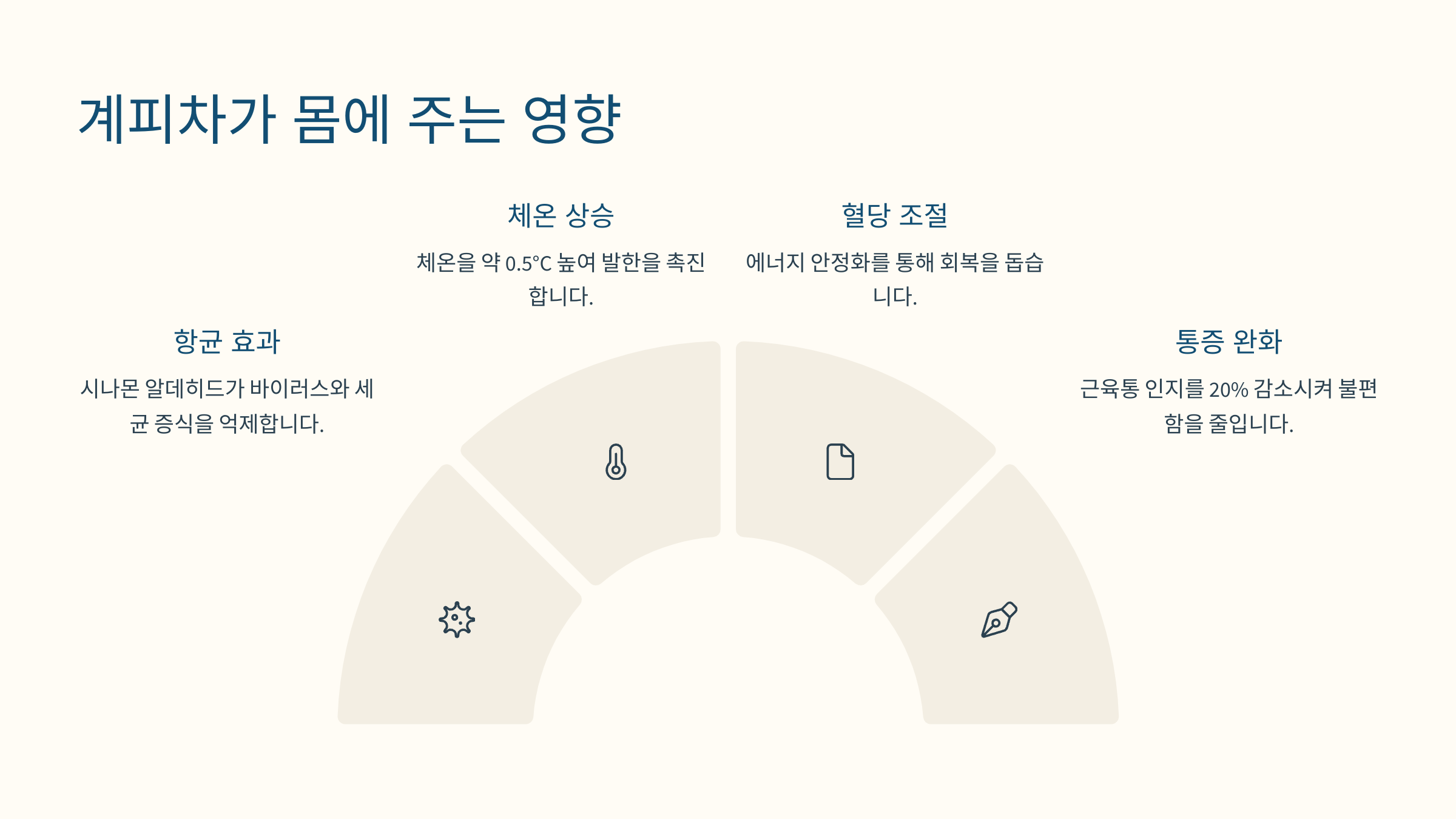 계피차는 몸살로 인한 한기(寒氣)를 없애고 땀을 나게 해주는 데 탁월한 차예요. 전통적으로 감기, 몸살, 배앓이 등에 쓰였고, 따뜻한 기운을 몸 깊숙이 전달해줘요. 몸이 으슬으슬할 때 계피차 한 잔이면 금세 열이 도는 걸 느낄 수 있어요.