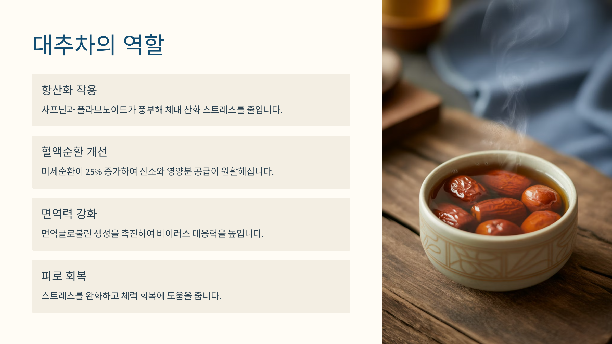 대추에는 비타민 C, A, B군이 풍부하고 항산화 성분인 플라보노이드도 들어 있어요. 이런 성분들이 면역 기능을 높여주고 피로회복에 도움이 돼요. 감기와 몸살이 올 때 먹으면 몸 전체의 회복력이 빨라진답니다.