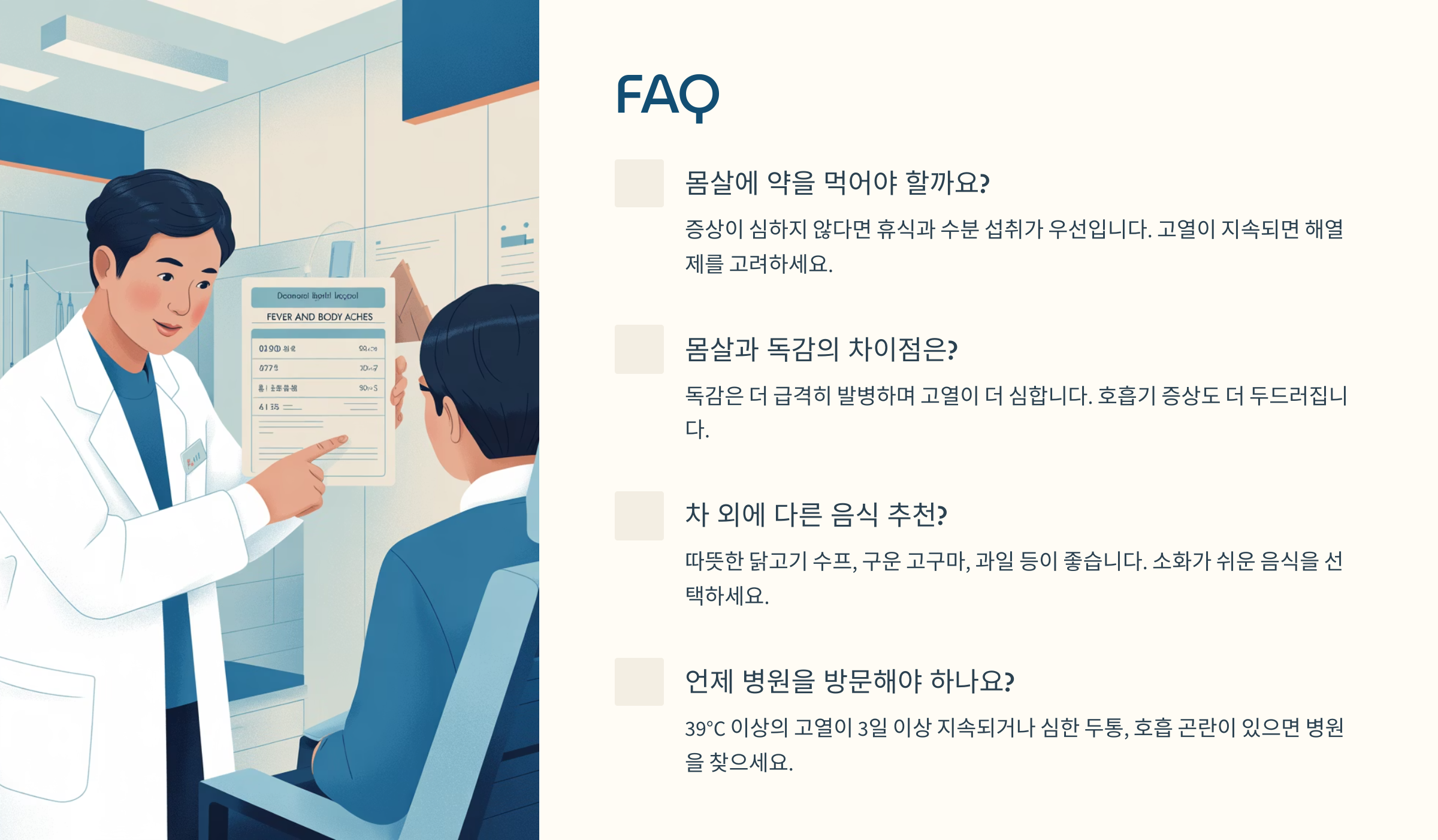 결국 몸살에 좋은 차는 내 증상과 체질에 맞게 골라야 해요. 따뜻한 물과 천연 재료만 있어도 집에서 손쉽게 만들 수 있으니 부담 갖지 말고 활용해보세요. 이제 마지막으로 자주 묻는 질문들 FAQ로 정리할게요!