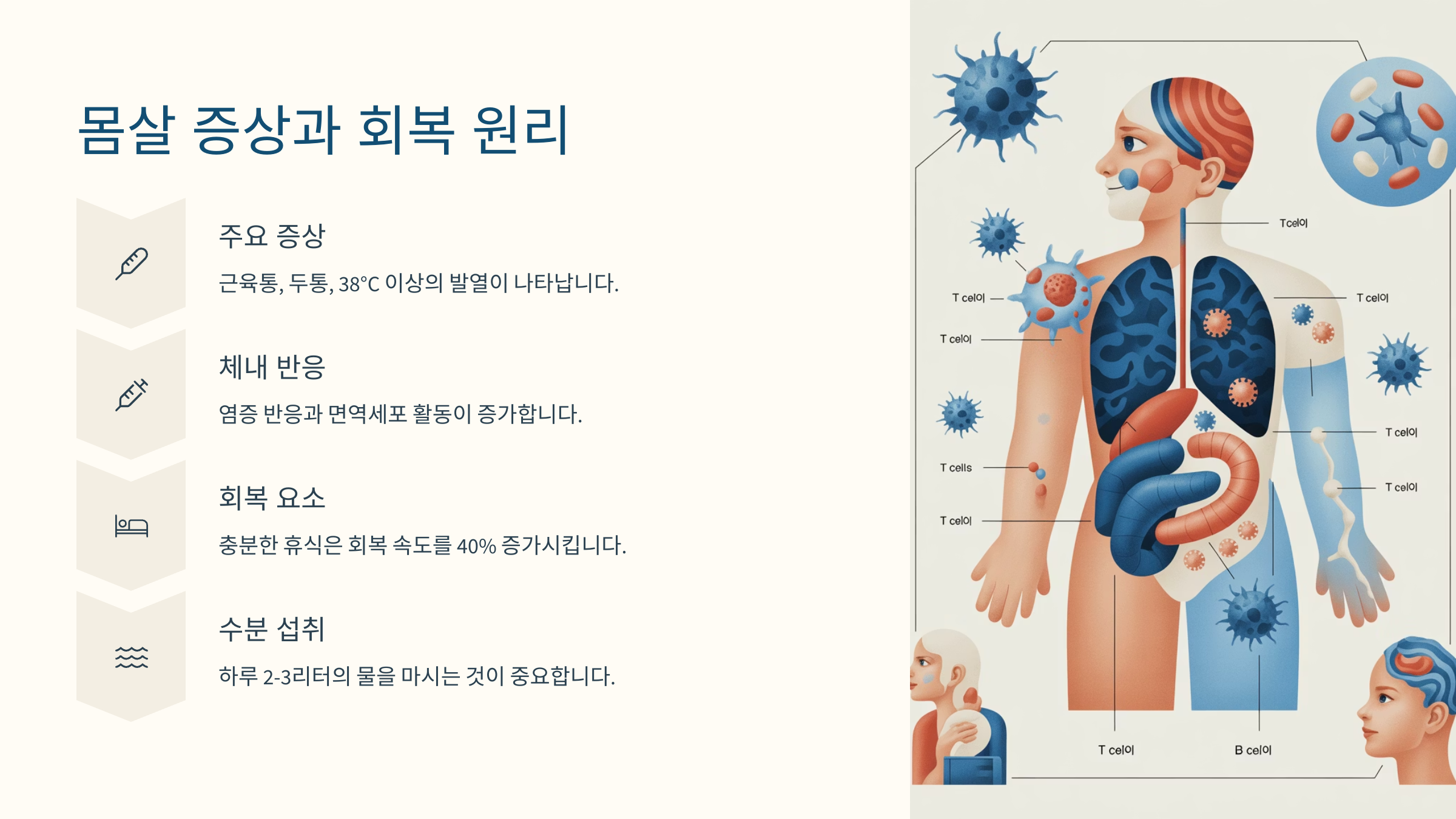 우리 몸은 몸살에 대응하기 위해 자연적으로 열을 내면서 체온을 높여요. 이는 바이러스를 죽이기 위한 면역 반응의 일환이에요. 그래서 열이 날 땐 억지로 식히기보다는 몸을 따뜻하게 해주는 게 더 도움이 되는 경우도 많아요.