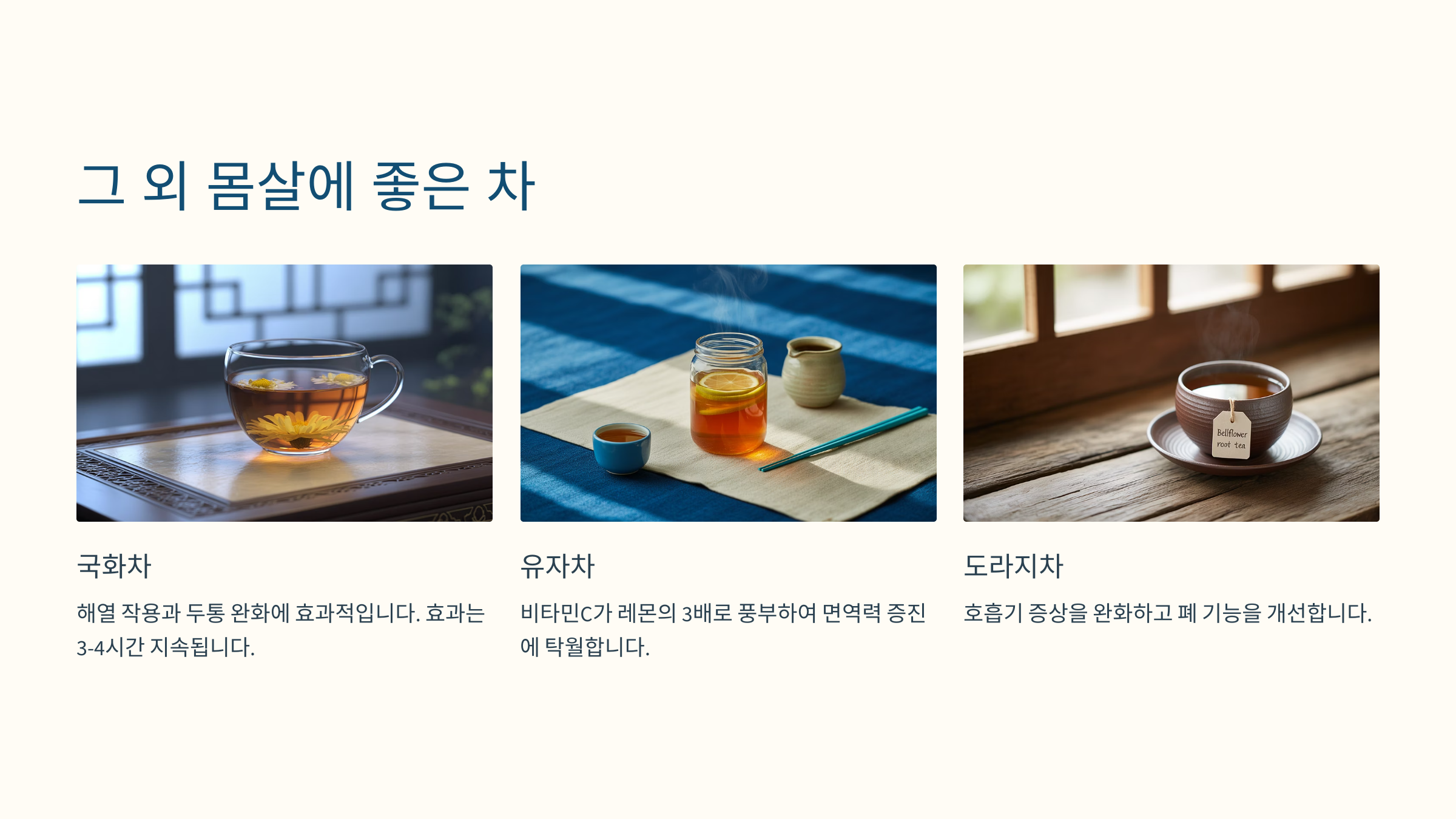 몸살이 심할 땐 입맛이 떨어지기 때문에, 따뜻하고 은은한 향을 가진 차가 위를 자극하지 않으면서 회복을 도와줘요. 다음 섹션에서는 몸살 증상별 회복 원리와 어떤 성분이 도움이 되는지 설명해볼게요.