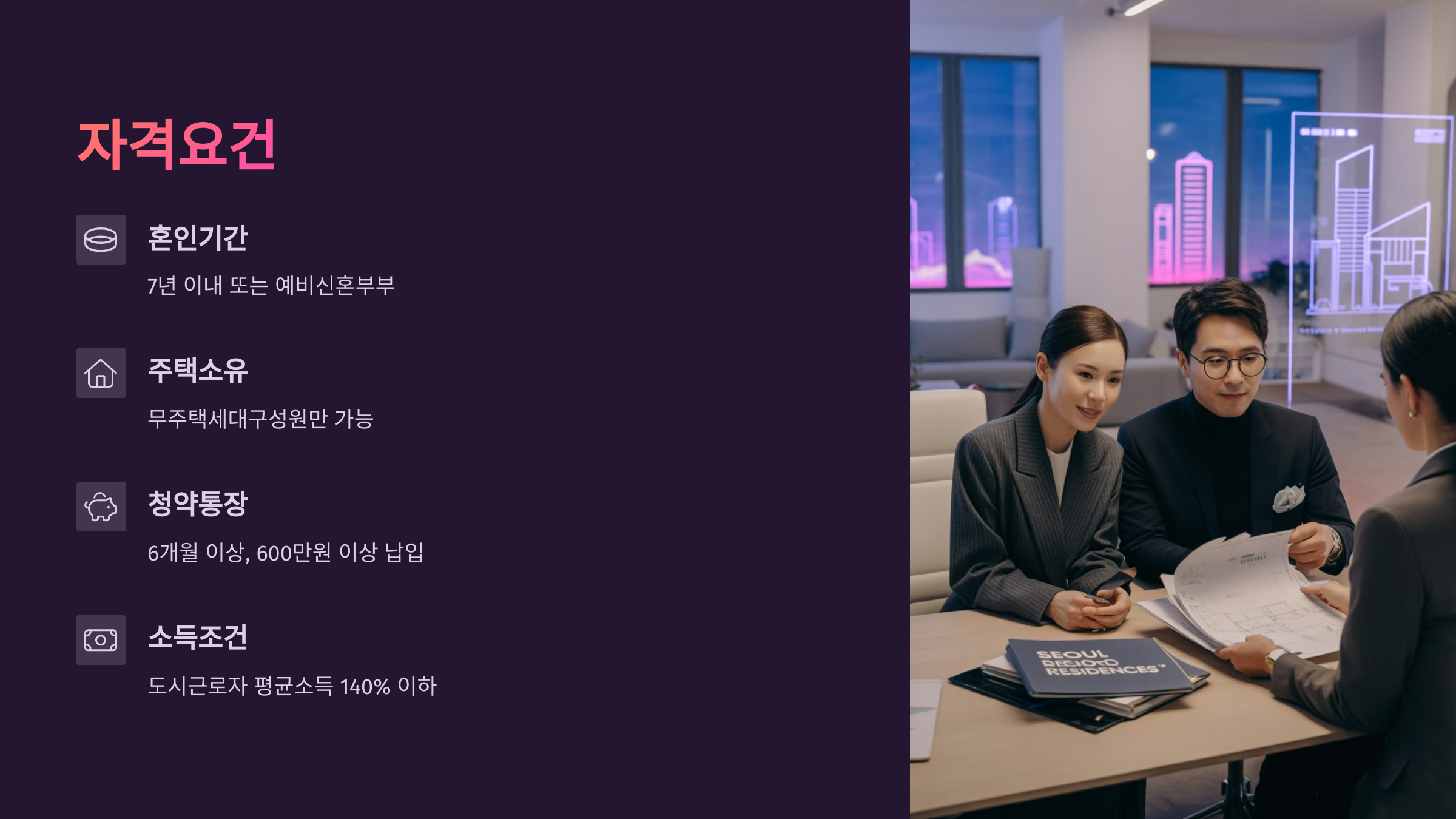 입주 자격은 비교적 폭넓어요. 혼인기간이 7년 이내이거나, 6세 이하 자녀가 있는 경우는 물론이고, 혼인을 계획 중인 예비신혼부부도 입주가 가능해요. 특히 태아를 포함한 가구 구성도 인정된다는 점에서 많은 부부가 혜택을 받을 수 있어요.