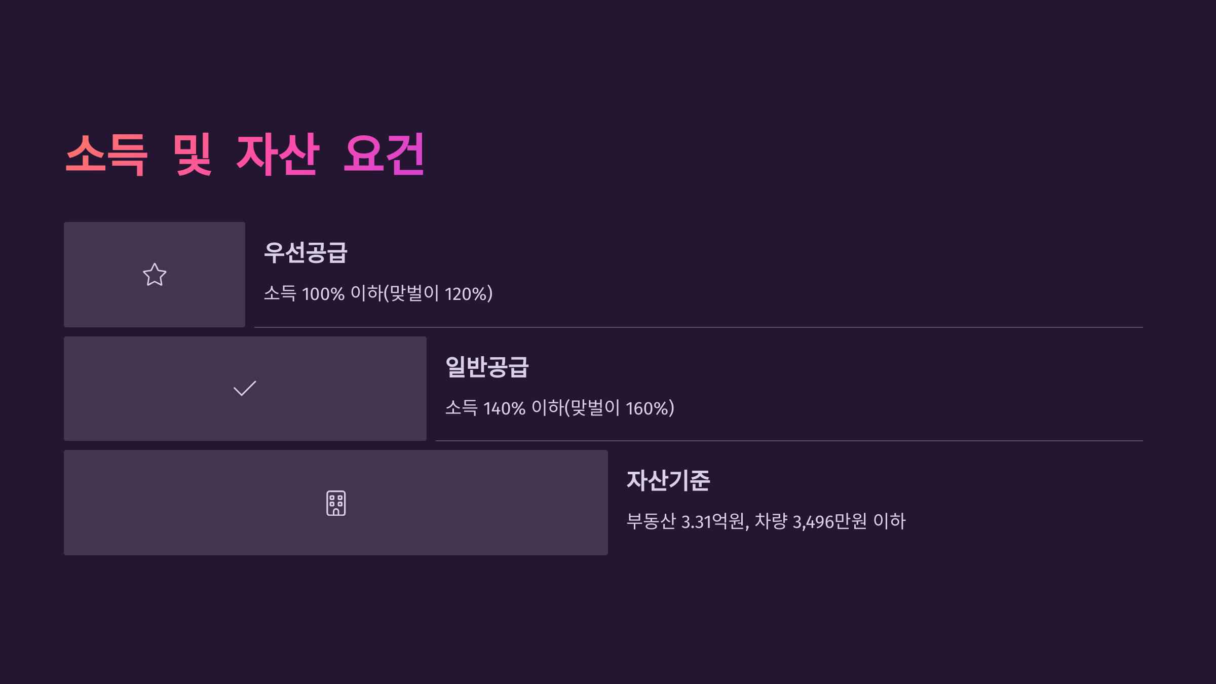 | 소득 기준 | 단독: 140%, 맞벌이: 160% | 전년도 도시근로자 월평균 기준 |