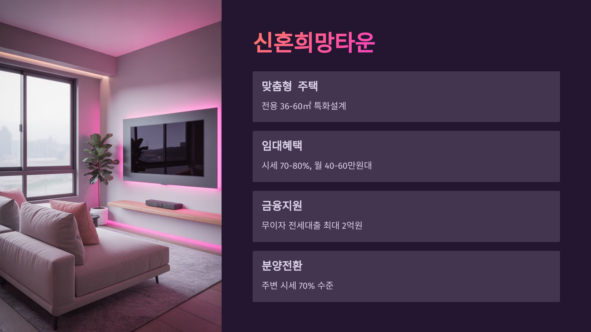 신혼희망타운은 신혼부부, 예비신혼부부, 그리고 6세 이하 자녀를 둔 한부모가족에게 공급되는 공공분양주택이에요. 기존의 특별공급과 달리 이 제도는 신혼가정을 위한 전용 주택 단지로 구성돼 있어서, 육아와 생활을 고려한 맞춤 설계가 특징이에요.