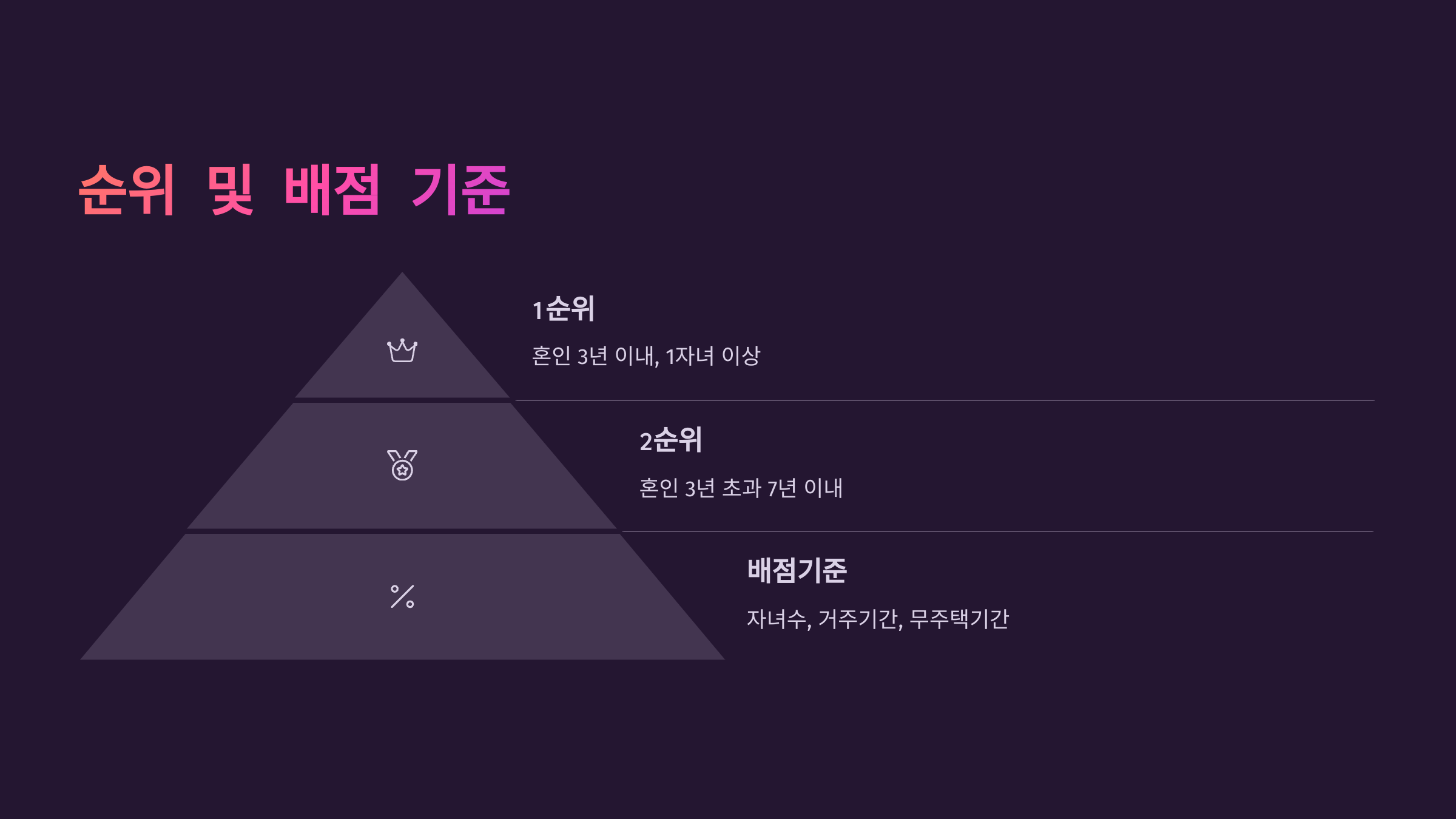 배점 방식은 아니지만 사실상 우선순위를 소득과 자녀 여부로 정하고 있어요. 즉, 소득이 낮고 자녀가 있을수록 유리하게 작용한다는 의미랍니다.