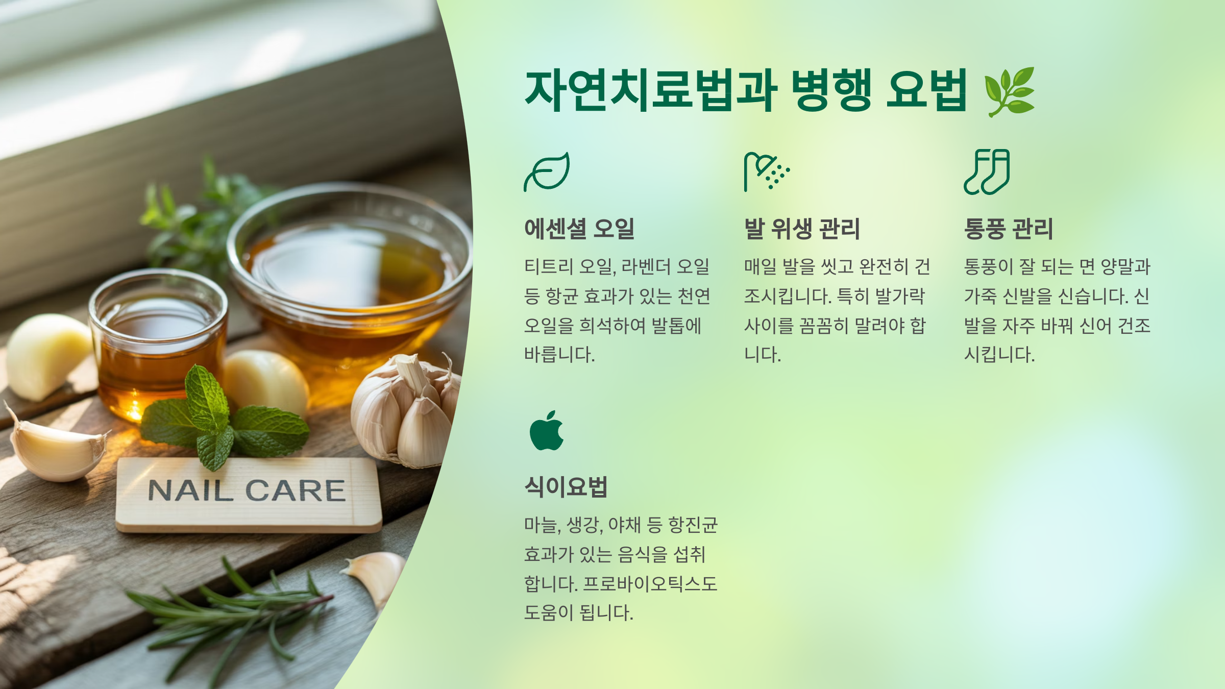 발톱무좀은 먹는 약이나 바르는 약만으로는 완전한 치료가 어려울 수 있어요. 생활습관 개선과 자연요법을 함께 병행하면 치료 효과를 높이고 재발률을 낮추는 데 큰 도움이 된답니다. 꾸준함이 핵심이에요!