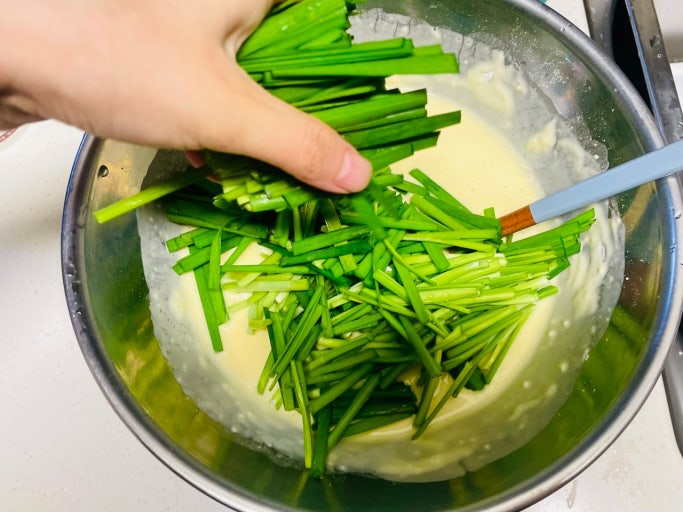 먼저 부추는 흐르는 물에 깨끗이 씻은 후 4~5cm 정도로 잘라 준비해 주세요. 부추는 씻은 뒤 물기를 확실히 제거해야 바삭한 전이 됩니다. 키친타월이나 채반에 올려 자연스럽게 물기를 빼는 것이 좋습니다.
