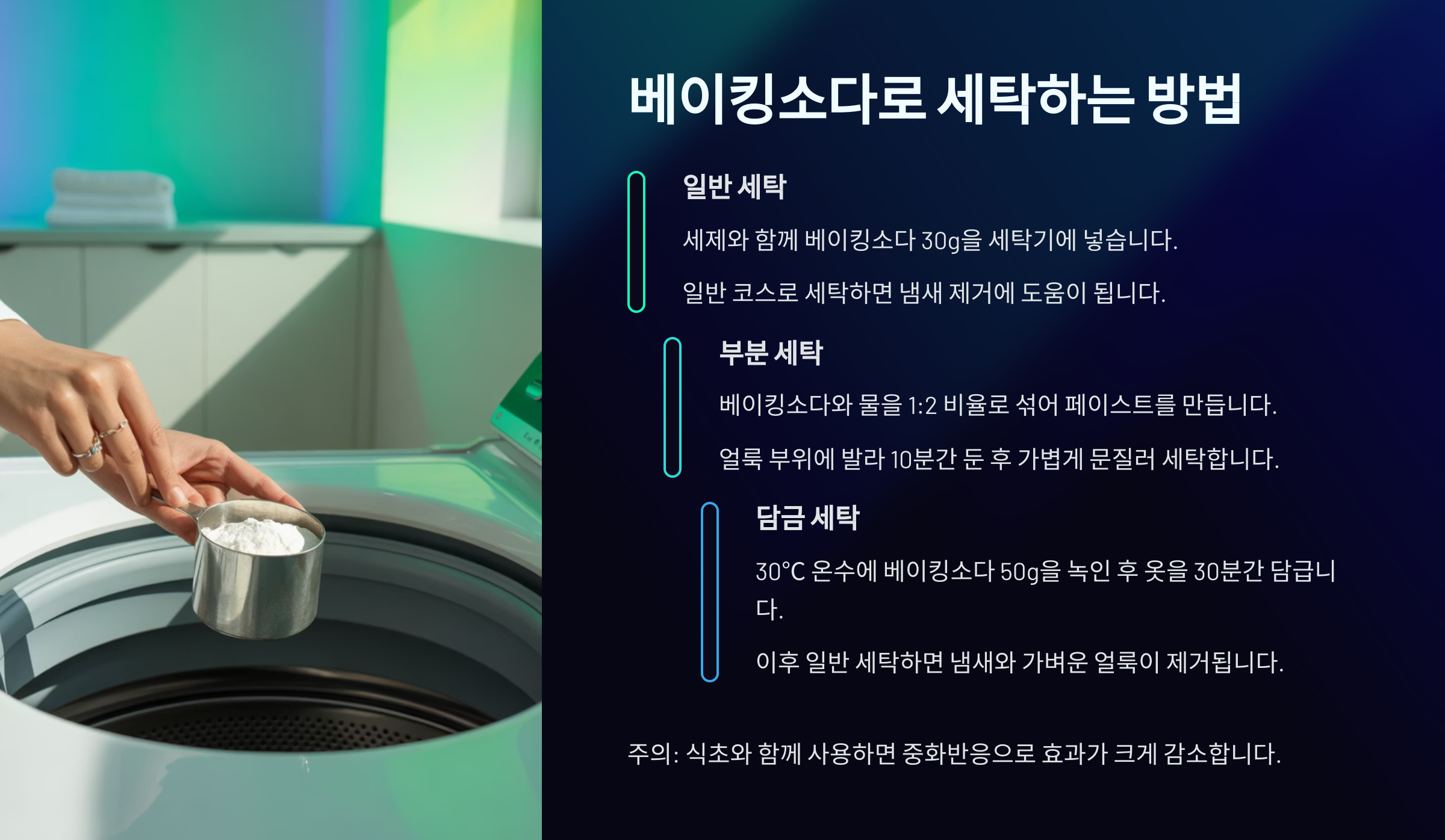 | 불림 세탁 | 베이킹소다+물에 30분 담그기 | 실크, 울 주의 |