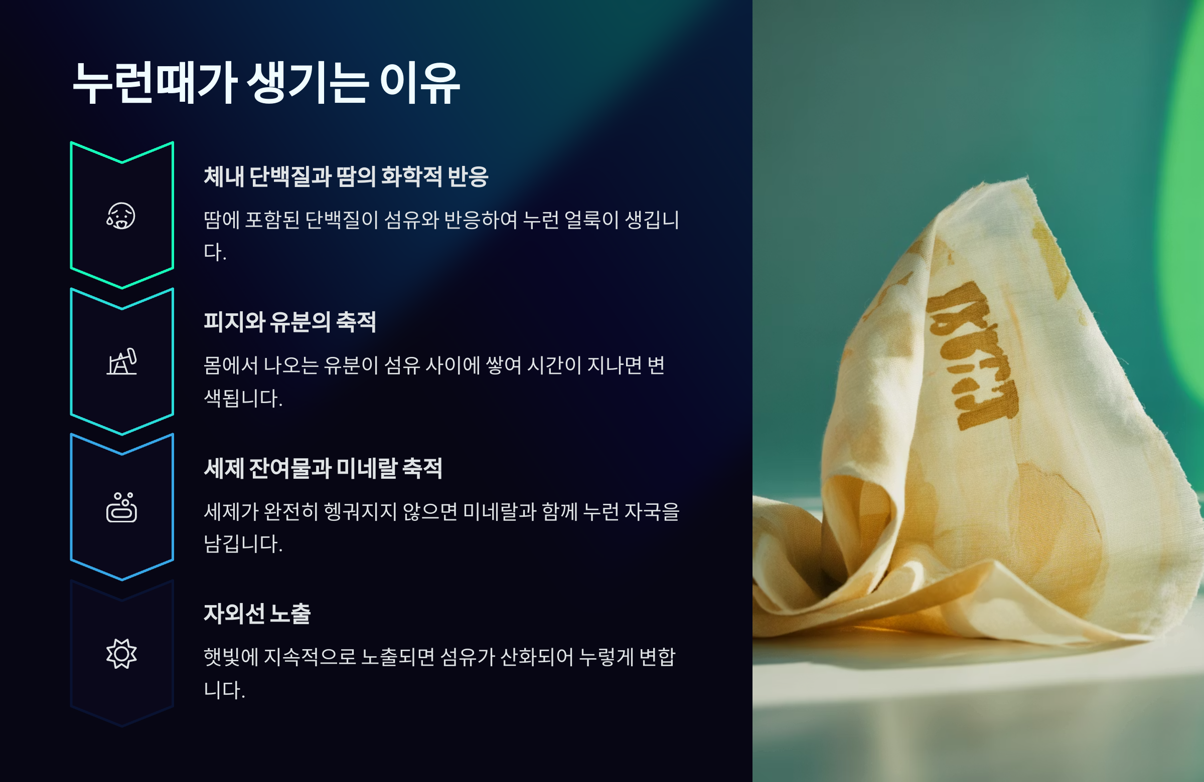 | 땀과 피지 | 체액과 유분이 섬유에 남아 산화 |