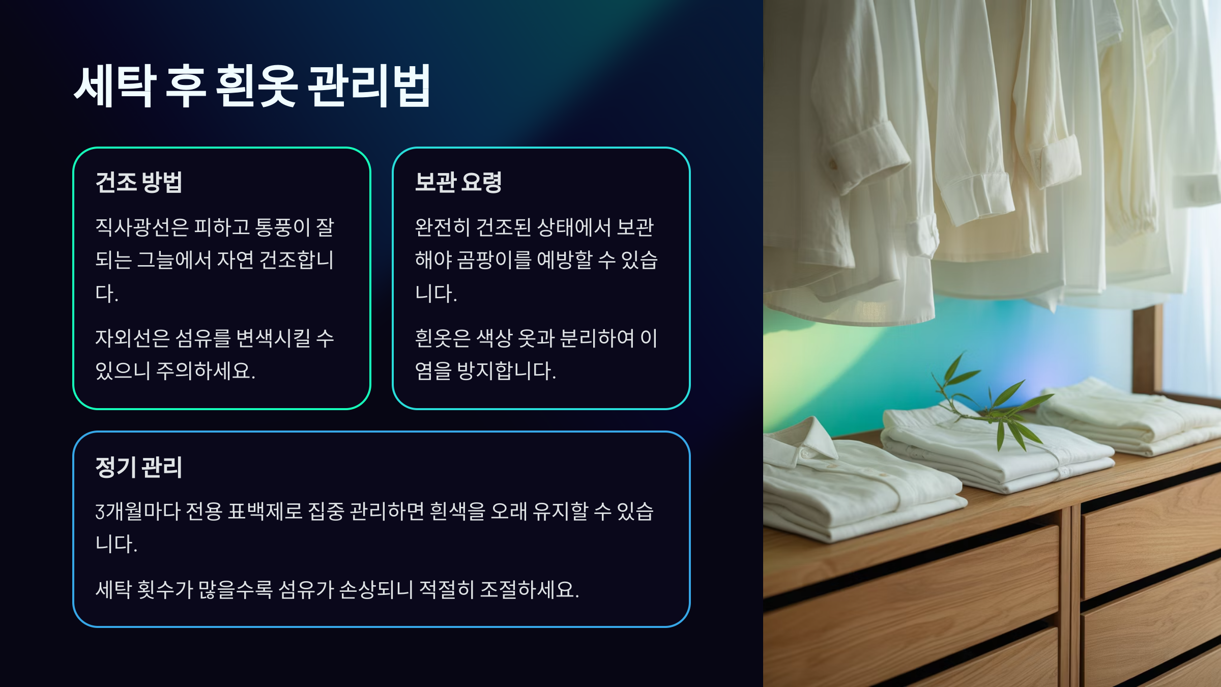 흰옷은 세탁만 잘한다고 끝이 아니에요. 세탁 후 어떻게 보관하고 관리하느냐에 따라 흰옷의 수명과 밝기가 달라질 수 있어요. 자외선, 먼지, 습기 등 외부 요인에 의해 쉽게 누렇게 변색되거나 오염될 수 있기 때문에 올바른 관리법이 중요해요.