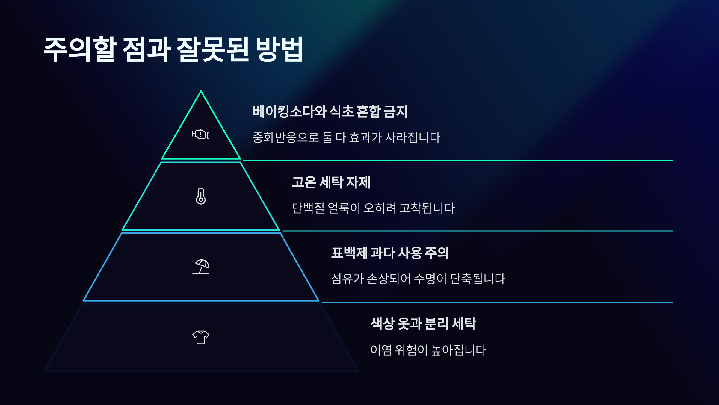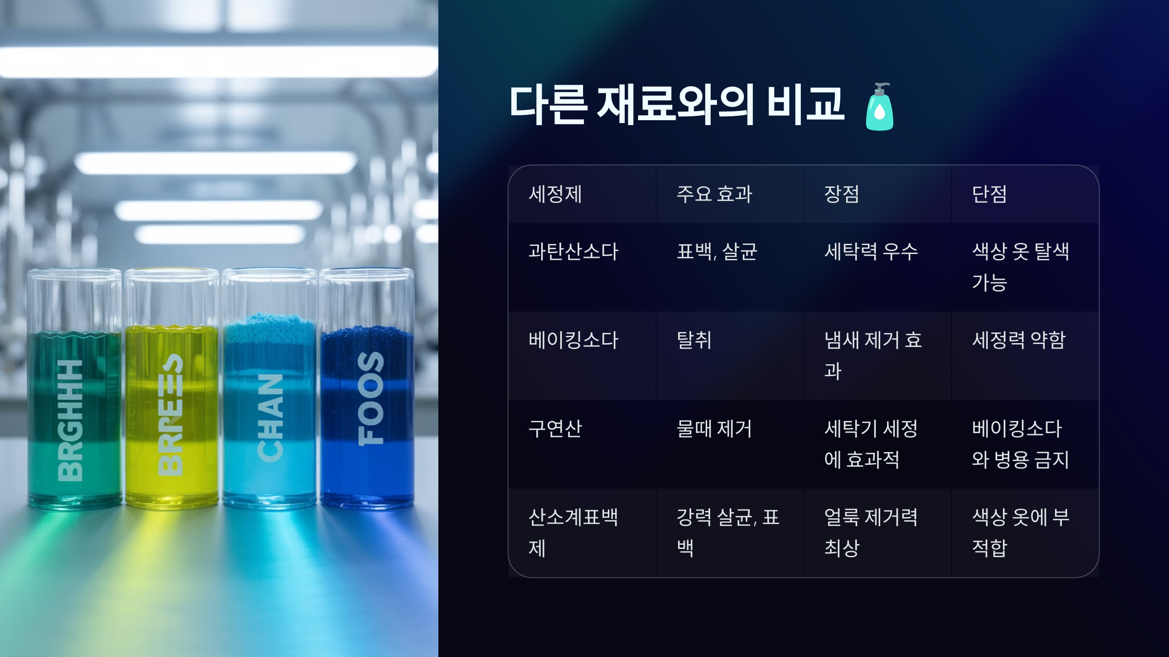 | 과탄산소다 | 강한 표백, 살균 | 고온 필요 |
