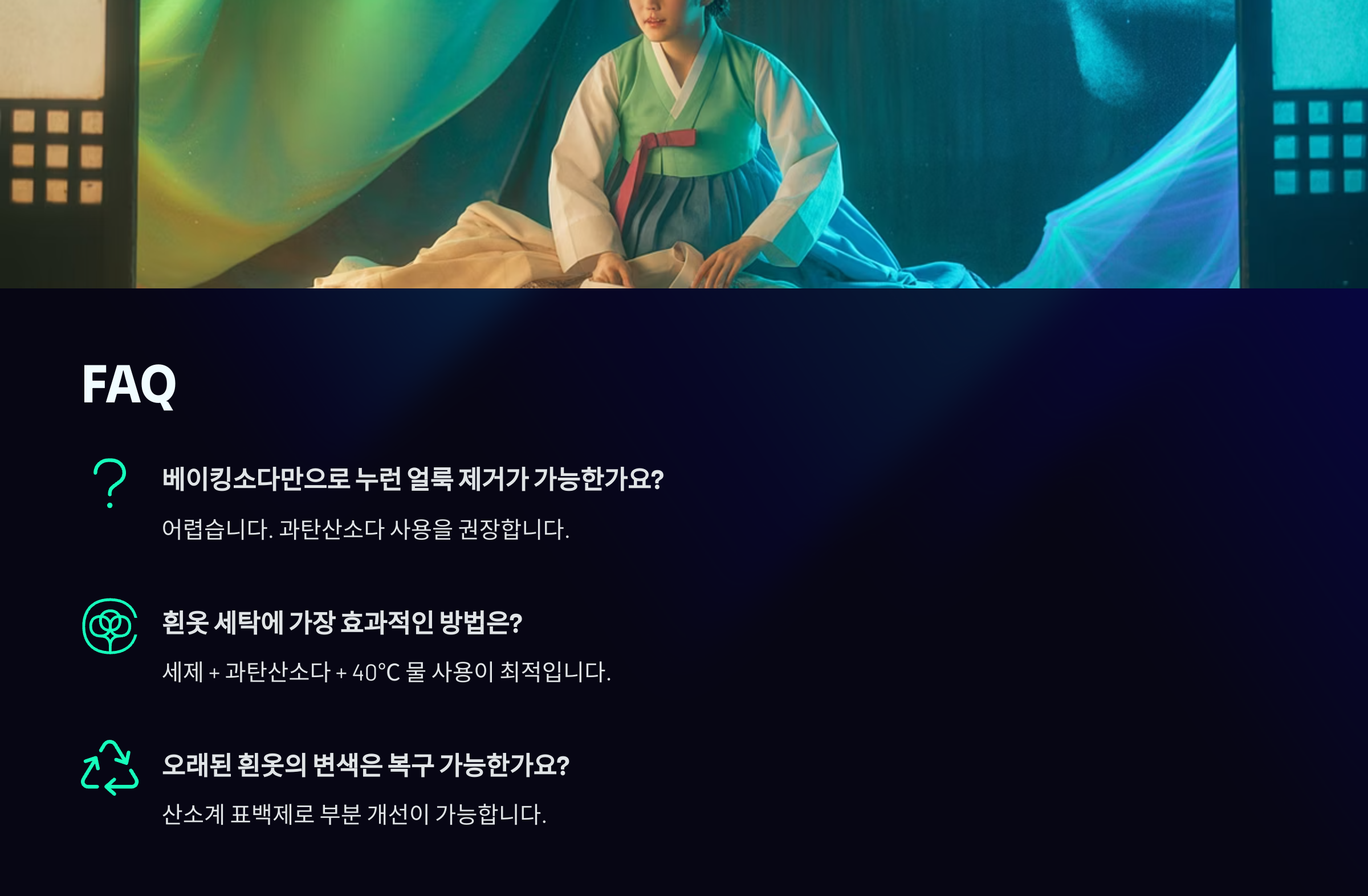 A8. 너무 오래된 누런 때는 한 번의 세탁으로는 완전히 제거되지 않을 수 있어요. 반복해서 불림과 세탁을 병행하면 좋아요.