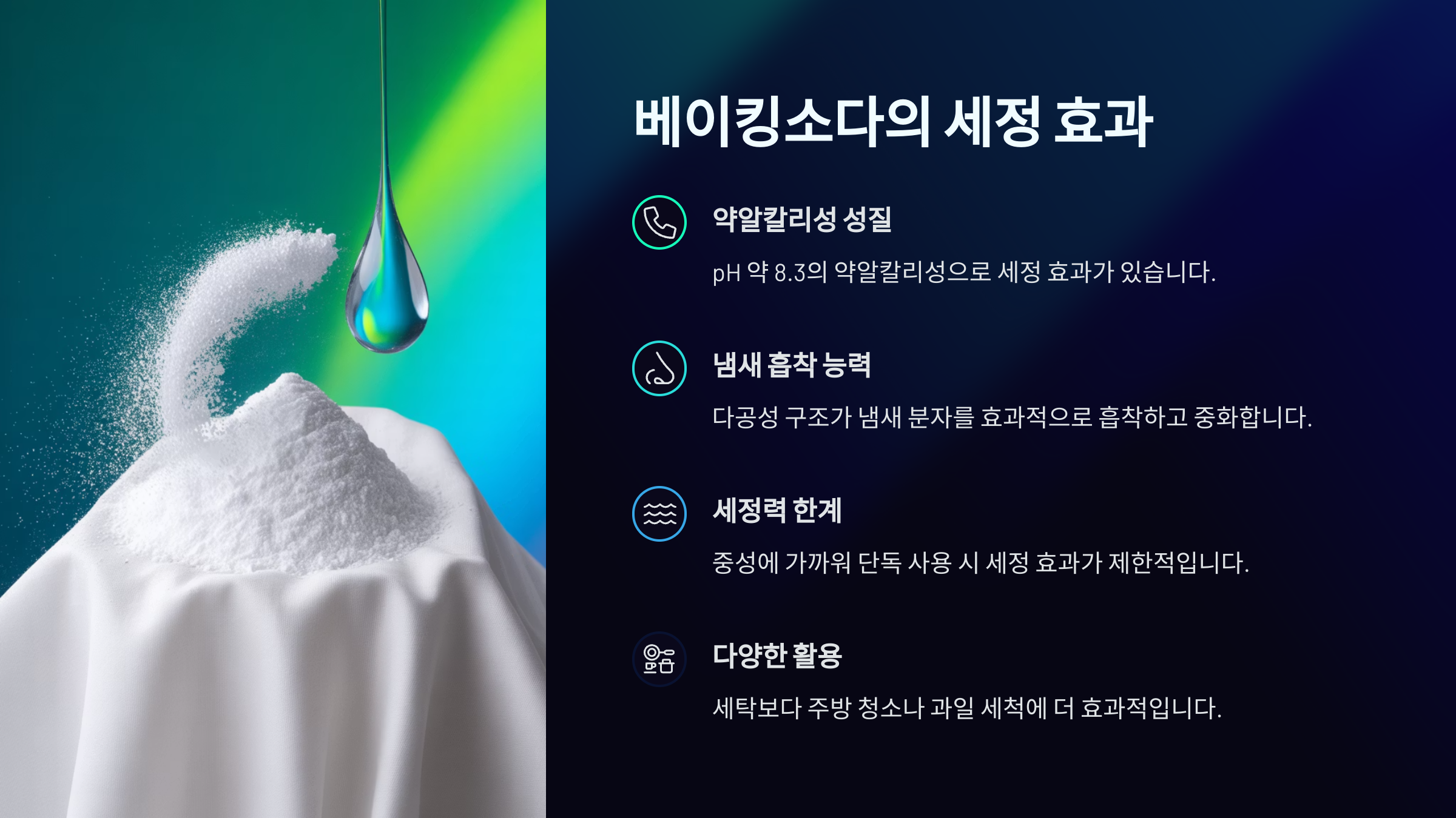 | 베이킹소다 | 중화, 탈취, 세정 | 울/실크 주의 |