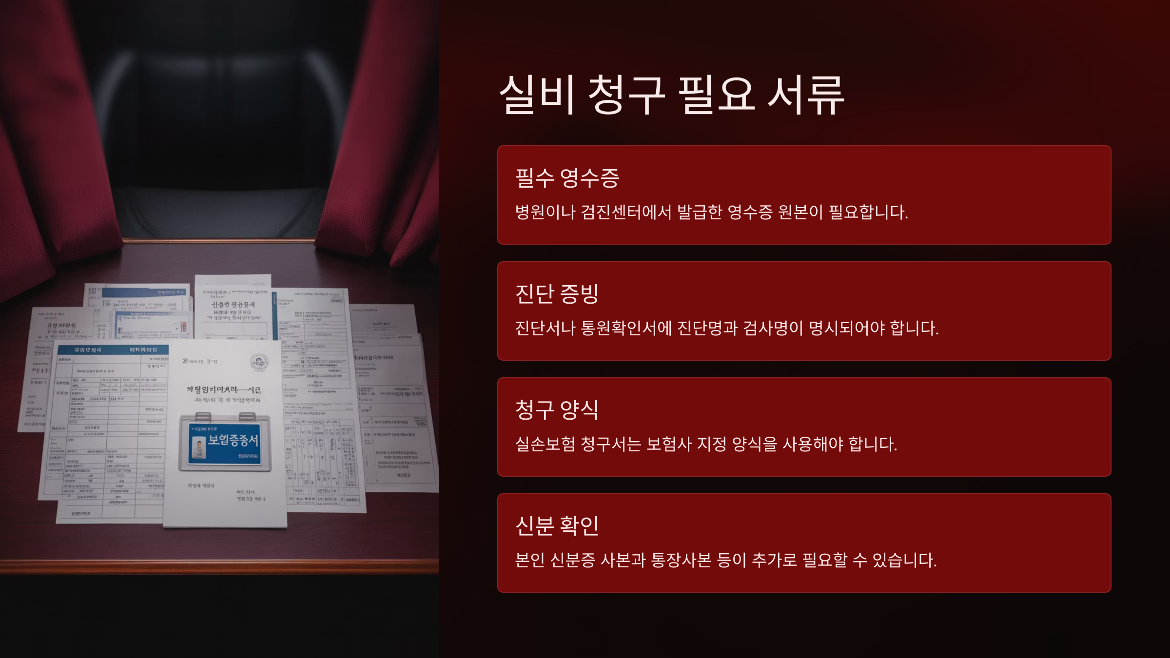 이제 어떤 조건에서 실비 청구가 가능한지 명확하게 알게 되었죠? 그럼 다음은 이 조건을 충족했을 때 실제로 어떤 서류들이 필요한지 알려드릴게요. 꼭 빠짐없이 준비해야 해요! 아래에서 계속됩니다 😊