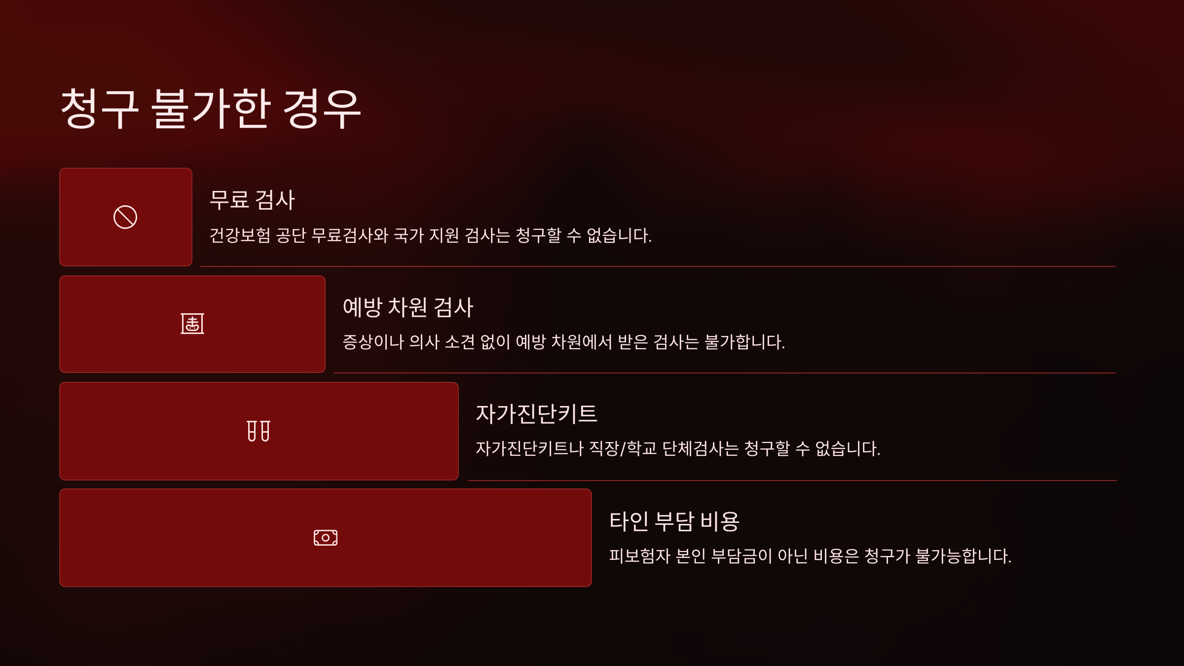 가장 흔한 거절 사유는 ‘개인의 자발적인 검사’예요. 예를 들어 해외여행을 앞두고 항공사에서 요구해서 검사를 받았거나, 회사 방침으로 PCR 검사를 받은 경우에는 실비 청구 대상이 아니에요. 왜냐하면 이러한 검사는 의료 목적이 아닌 행정 목적이기 때문이죠.