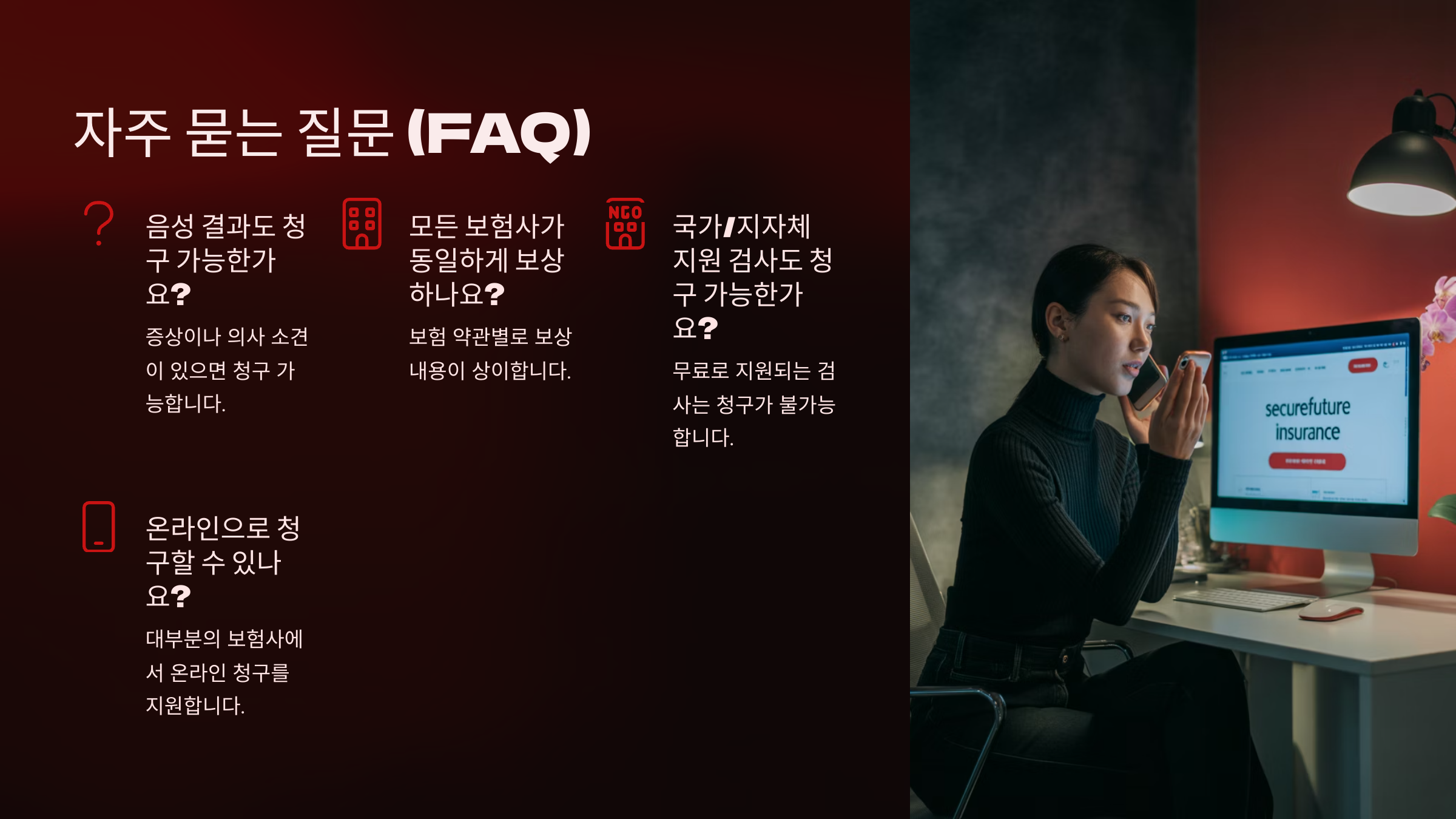보험금을 받기 위한 가장 중요한 기준은 ‘의학적 필요성’이에요. 그러니 코로나 검사를 받기 전에 증상이 있는 경우 병원을 방문해서 진료를 받은 뒤, 의사의 판단 하에 검사를 진행하는 것이 좋아요. 그 과정에서 나온 서류들은 모두 보관해두는 걸 잊지 마세요!
