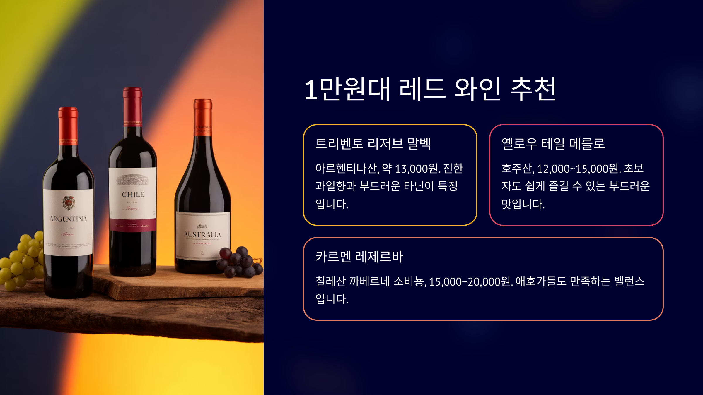 레드 와인은 풍부한 바디감과 과일향이 특징이에요. 하지만 비싼 와인만 좋은 건 아니에요! 요즘엔 만 원대에도 입문자부터 애호가까지 만족할 수 있는 퀄리티 좋은 와인이 많답니다.