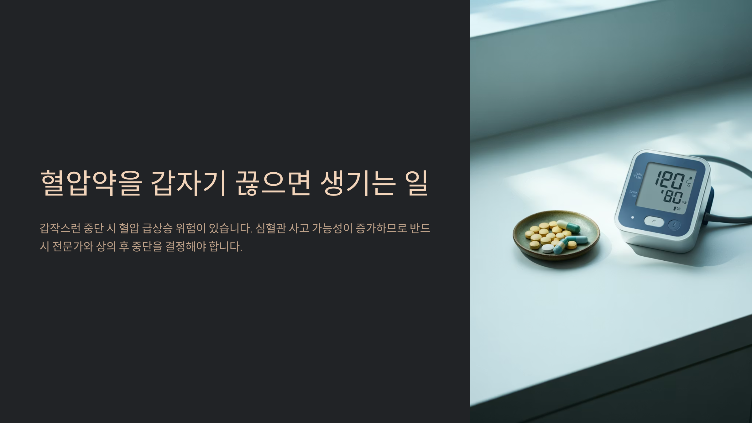 지금부터는 혈압약을 갑자기 끊었을 때 몸에 생기는 변화와 위험 요소들, 그리고 올바른 중단 방법까지 꼼꼼히 알려드릴게요. 약 복용 중이거나 끊을까 고민 중이라면 꼭 읽어보세요!