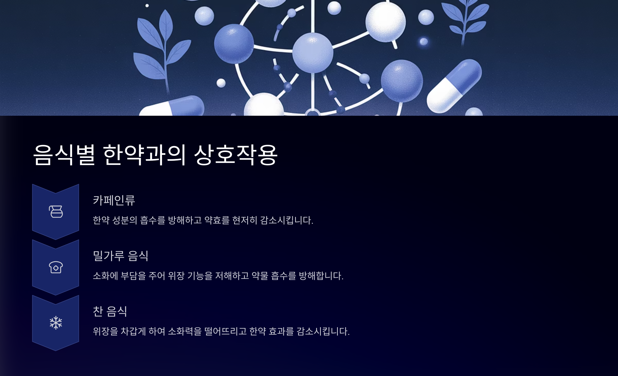 | 찬 음식 | 한약의 따뜻한 성질 방해 | 아이스크림, 냉면 등 |