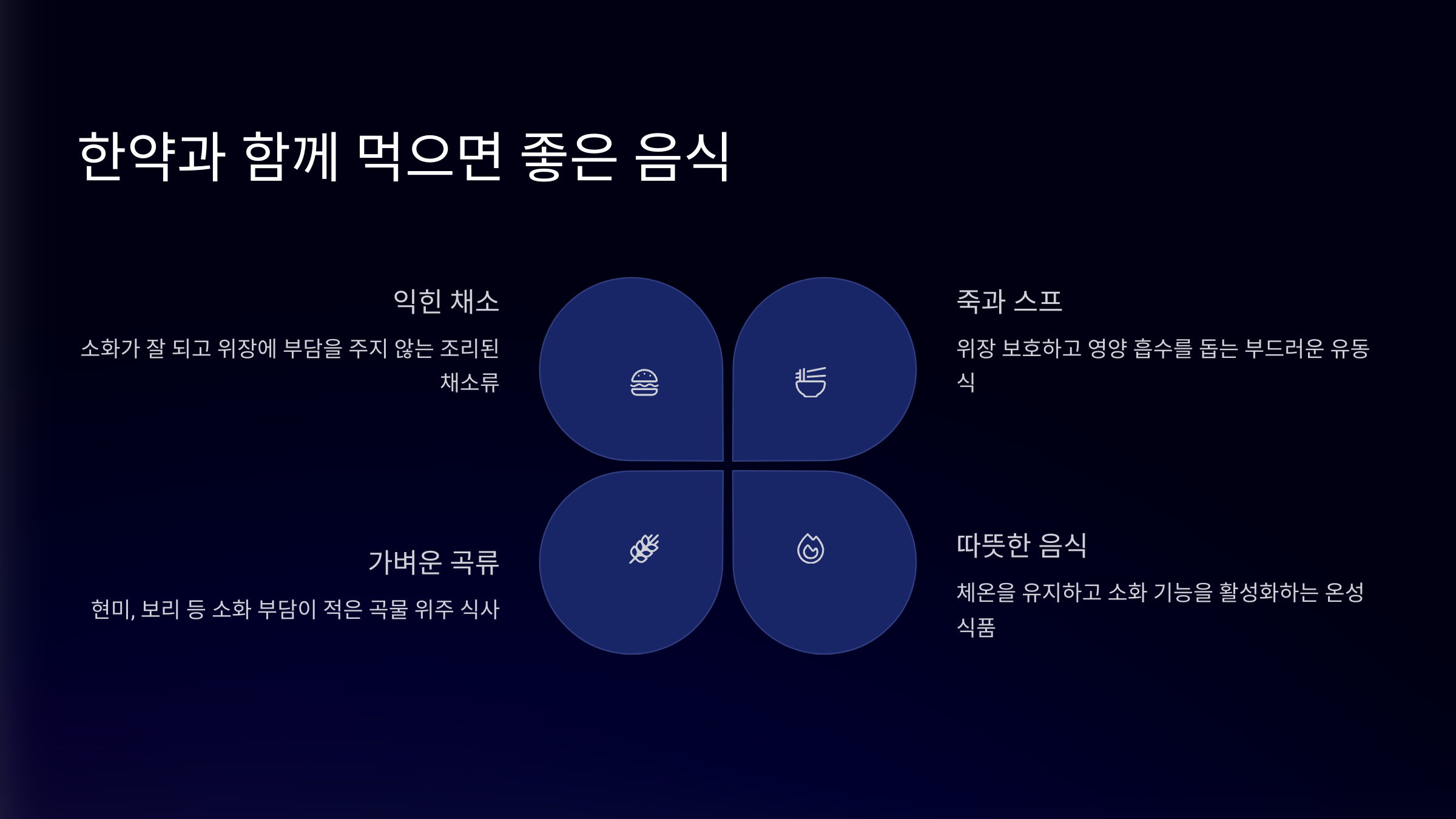 | 고구마 | 위장 기능 강화 | 너무 달게 조리 금지 |