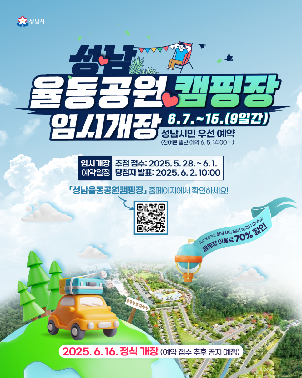 율동공원 오토캠핑장은 2025년 6월 16일부터 정식으로 운영될 예정이에요. 정식개장 이후에도 성남시민 우선 예약제로 운영되며, 잔여분은 타 지역 주민에게도 개방돼요.