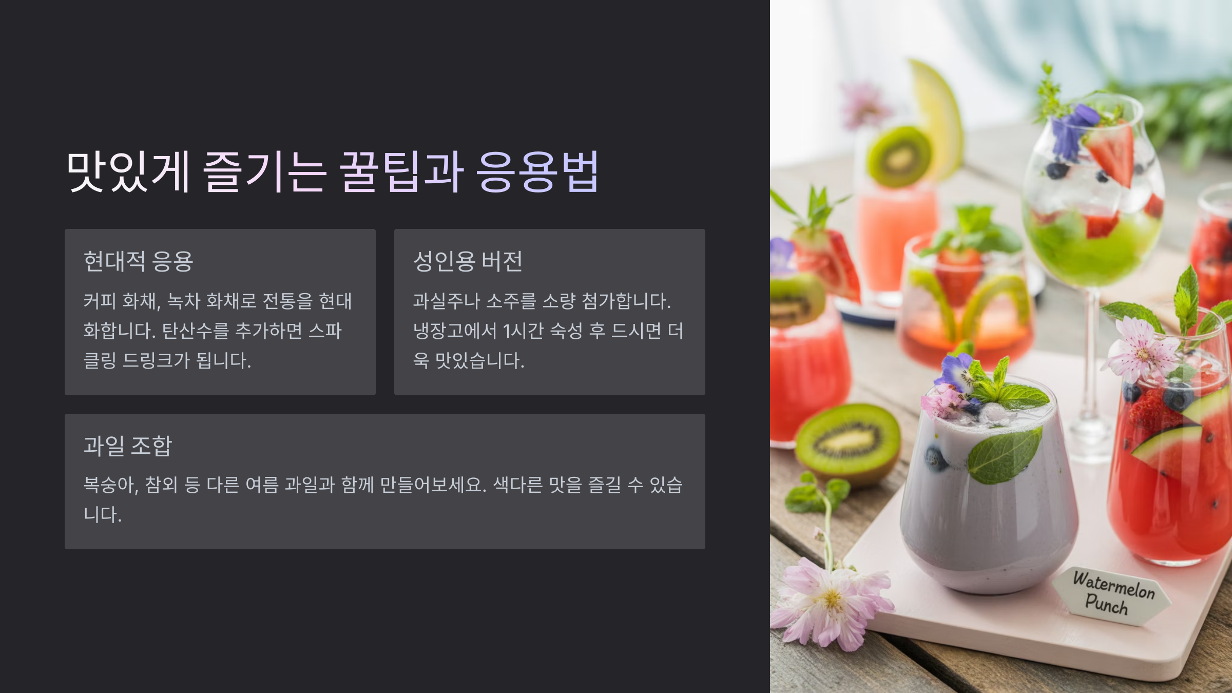 화채 안에 들어가는 과일도 자유롭게 변경할 수 있어요. 파인애플, 키위, 체리, 청포도, 블루베리 등을 섞으면 더욱 화려한 비주얼과 다양한 식감을 즐길 수 있어요. 아이스크림 한 스쿱을 올려주면 프리미엄 디저트 느낌도 나죠!