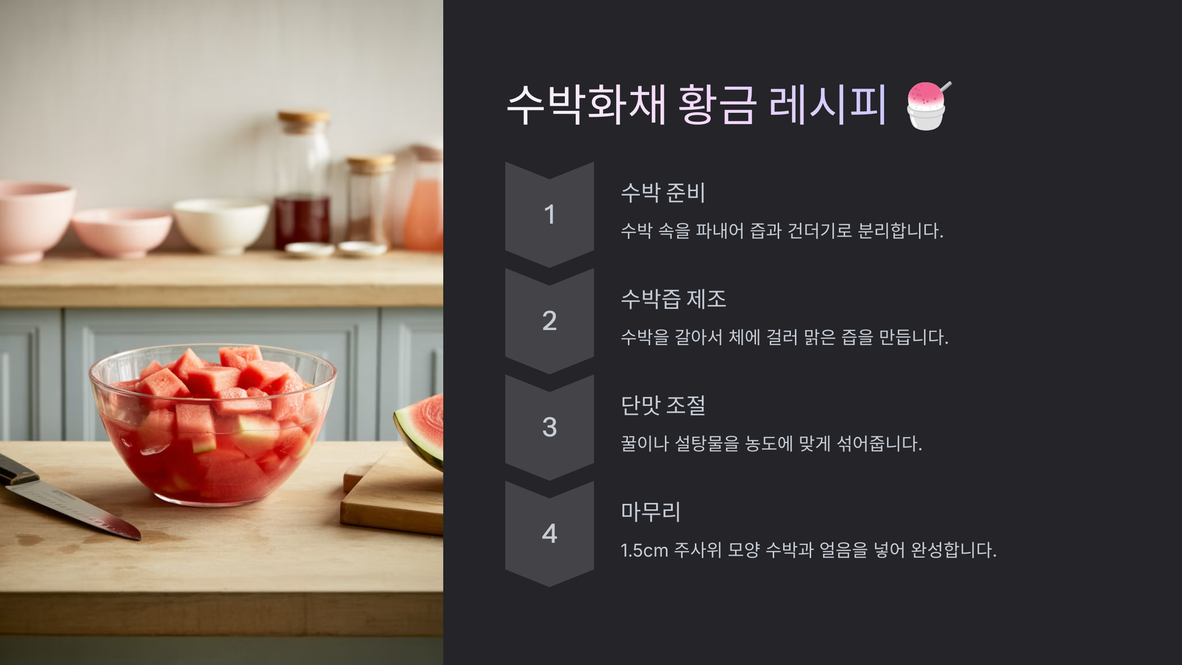 이제 본격적으로 수박화채를 만들어볼 시간이에요! 재료와 도구가 모두 준비되었다면, 만드는 방법은 정말 간단해요. 단계를 하나씩 차근히 따라오세요. 😊