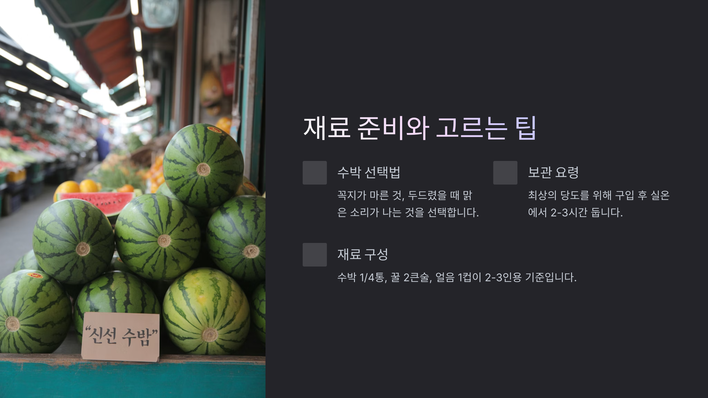 수박은 껍질이 짙고 두드렸을 때 '통통' 울리는 소리가 나는 게 좋고, 당도가 높은 과육을 선택하는 게 좋아요. 너무 익은 수박은 물이 많이 나와 우유와 섞였을 때 물 맛이 나니까 적당히 단단한 걸 고르는 게 포인트예요.