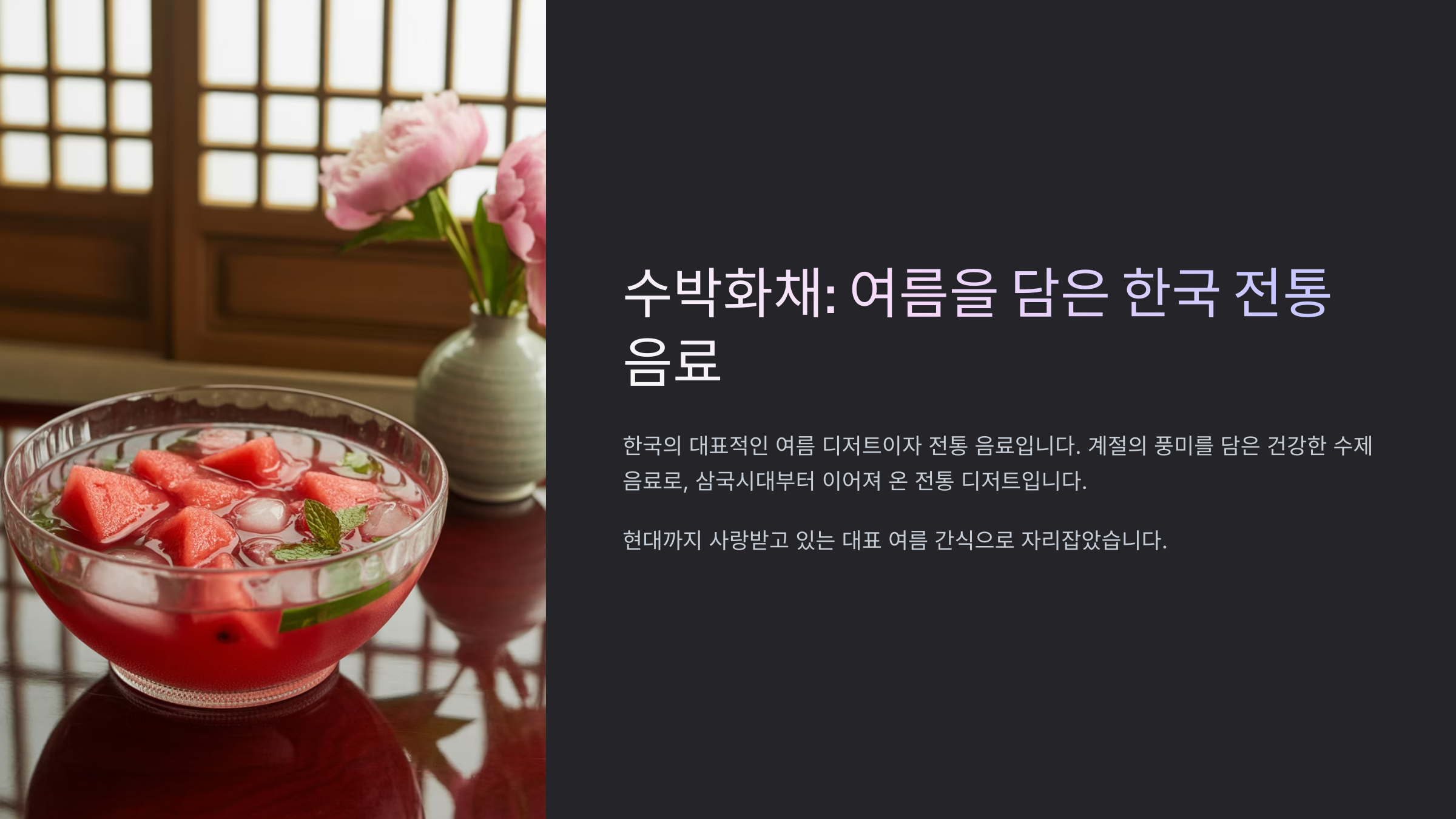 그 중에서도 수박화채는 더위에 지친 사람들을 위한 최고의 간식이 되었어요. 한입 먹을 때마다 입 안 가득 시원함이 퍼지고, 당분이 떨어진 몸에 에너지를 충전해줘서 여름철 간식이나 디저트로 제격이에요.
